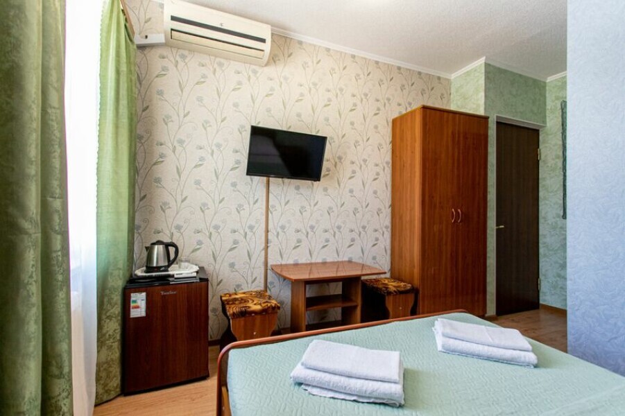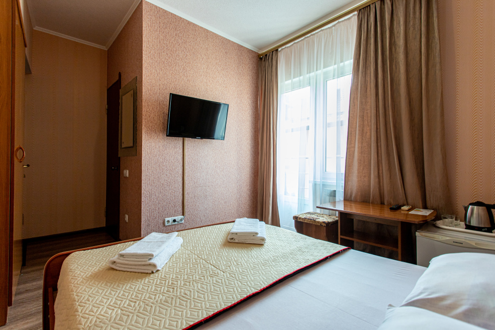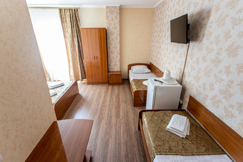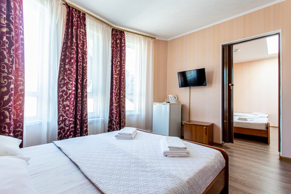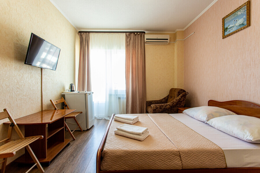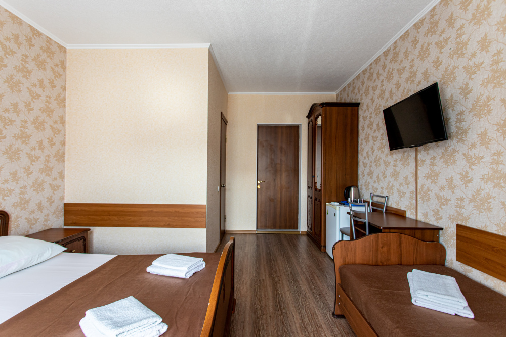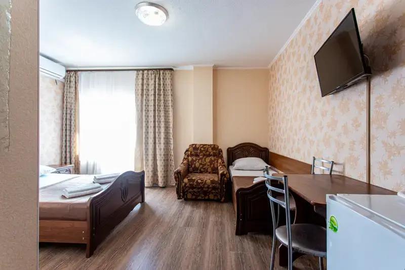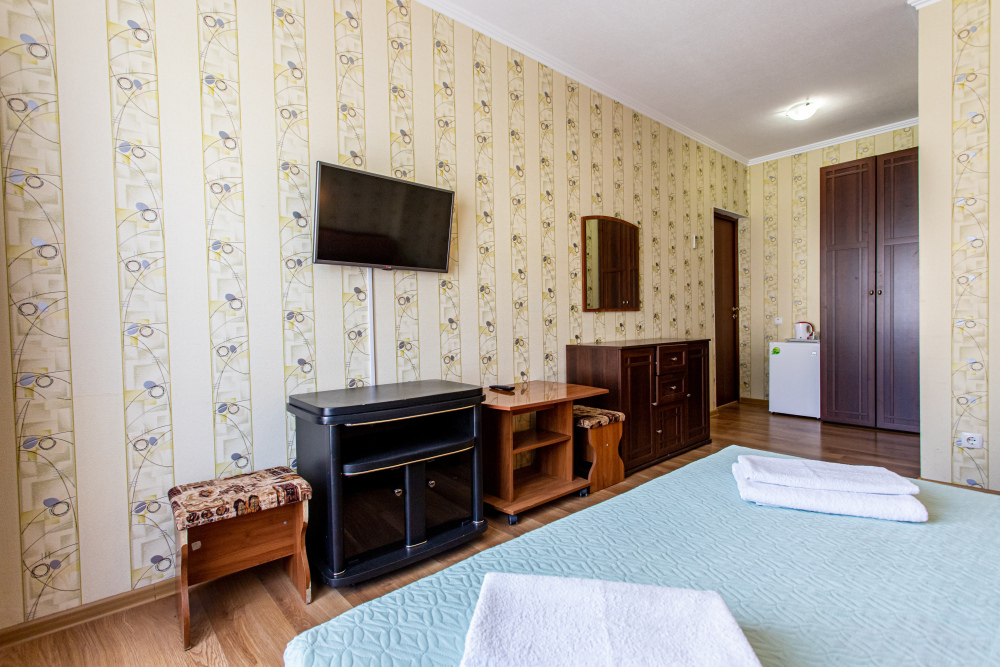 Из удобств, для комфортного проживания есть телевизор, сплит-система, чайник, холодильник, в номере два балкона. Предоставляется постельное белье, полотенца (по количеству гостей) и гигиенические принадлежности. Уборка и смена белья производится один раз в 5 суток и по требованию гостя. Вынос мусора - самостоятельный.