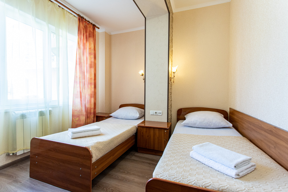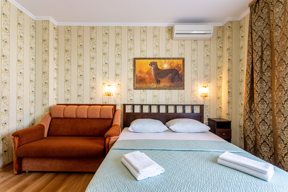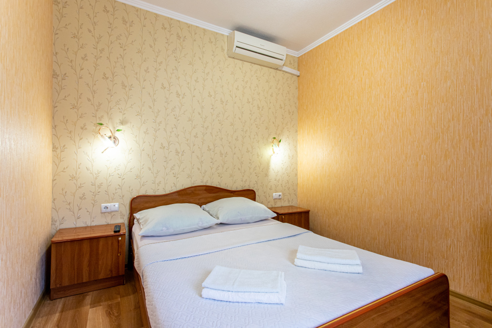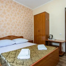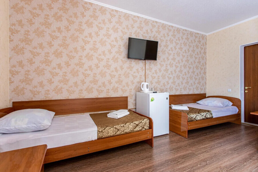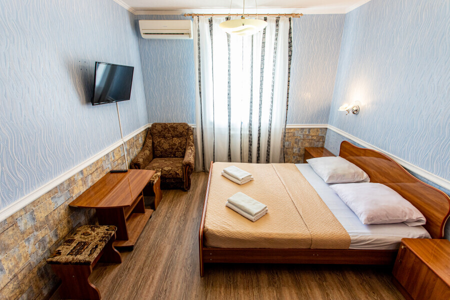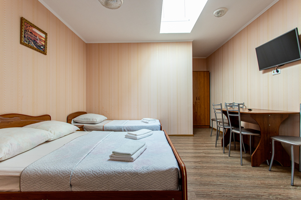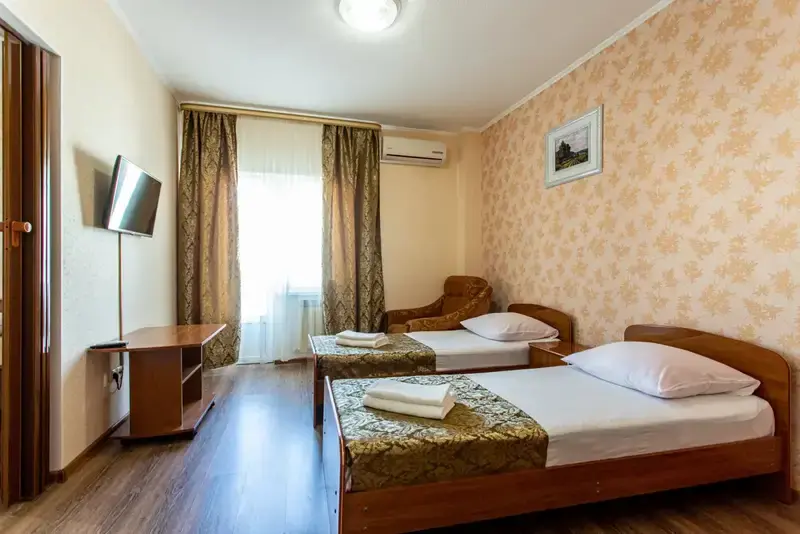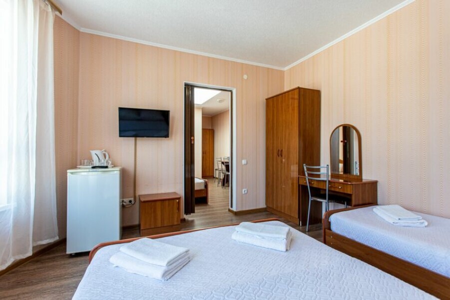 Из удобств, для комфортного проживания есть телевизор, сплит-система, чайник, холодильник, в номере два балкона. Предоставляется постельное белье, полотенца (по количеству гостей) и гигиенические принадлежности. Уборка и смена белья производится один раз в 5 суток и по требованию гостя. Вынос мусора - самостоятельный.