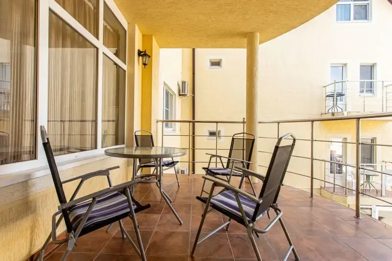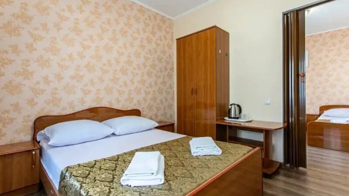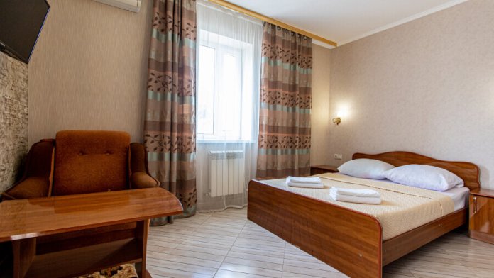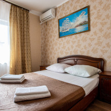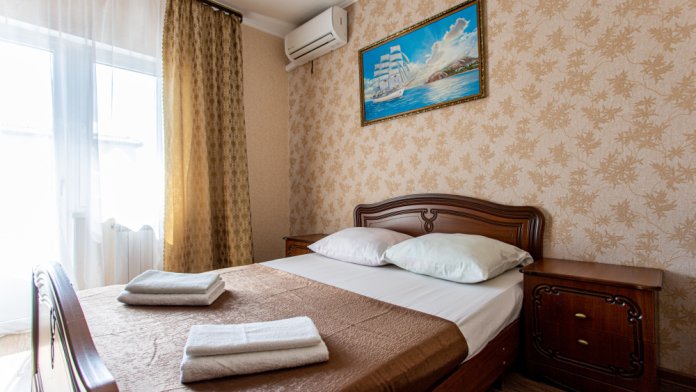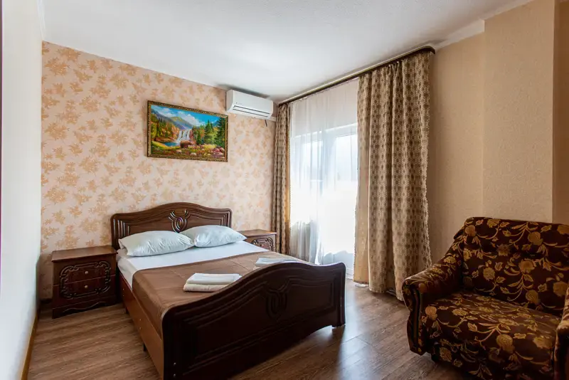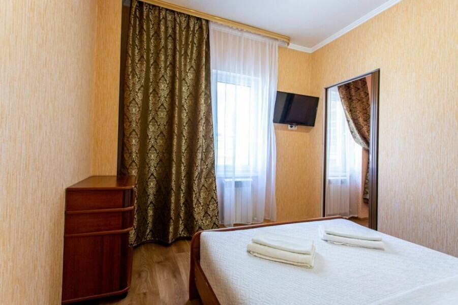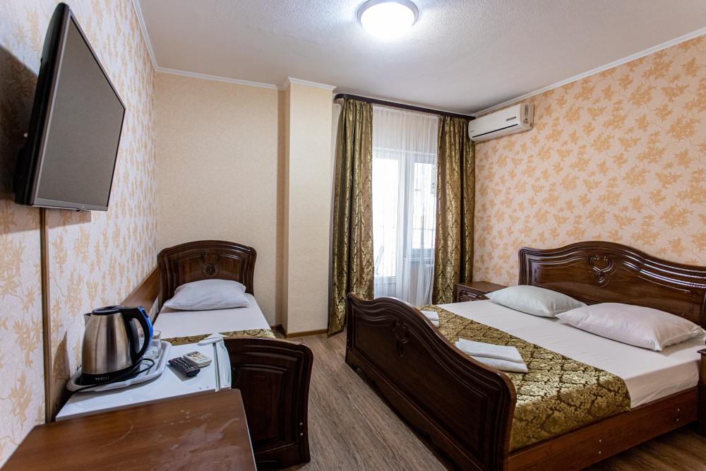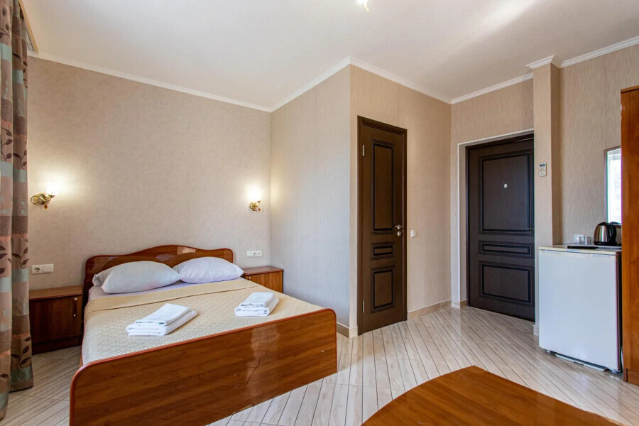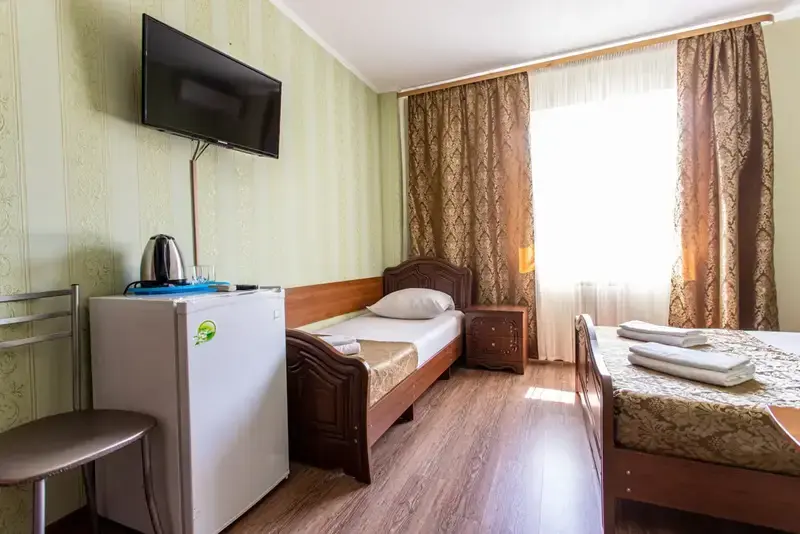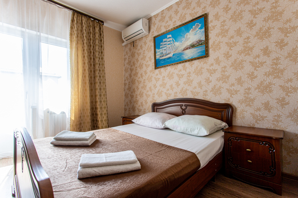 Из удобств, для комфортного проживания есть телевизор, сплит-система, чайник, холодильник, в номере два балкона. Предоставляется постельное белье, полотенца (по количеству гостей) и гигиенические принадлежности. Уборка и смена белья производится один раз в 5 суток и по требованию гостя. Вынос мусора - самостоятельный.