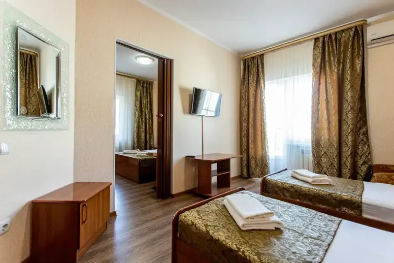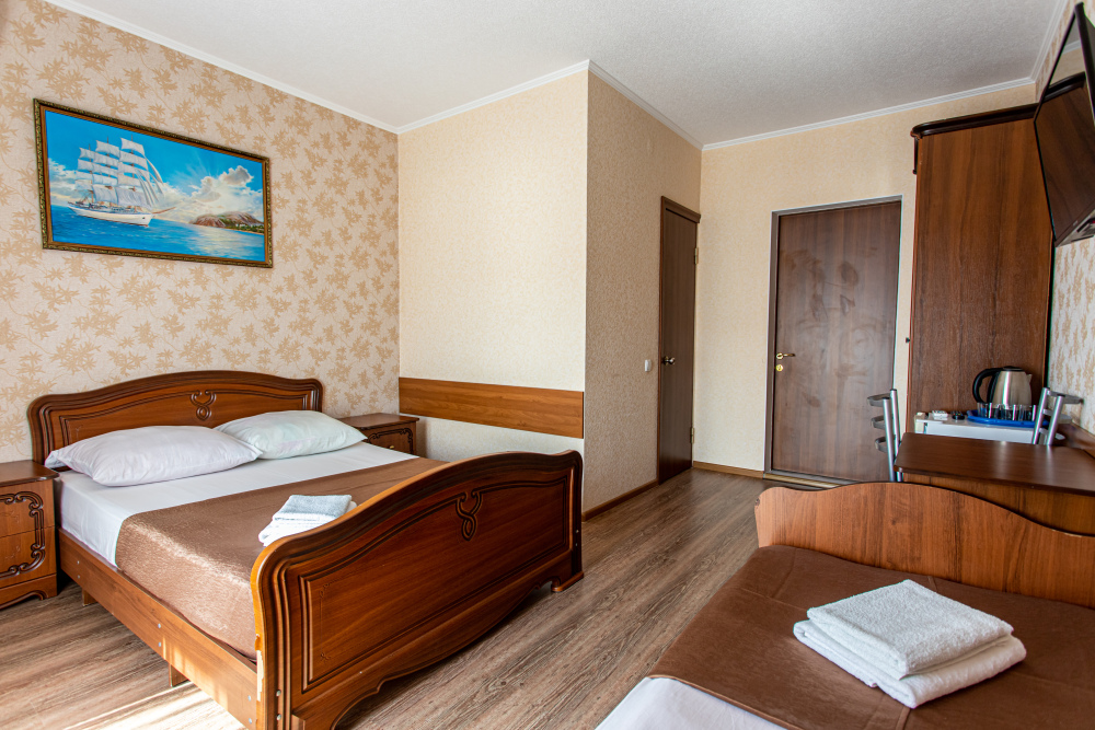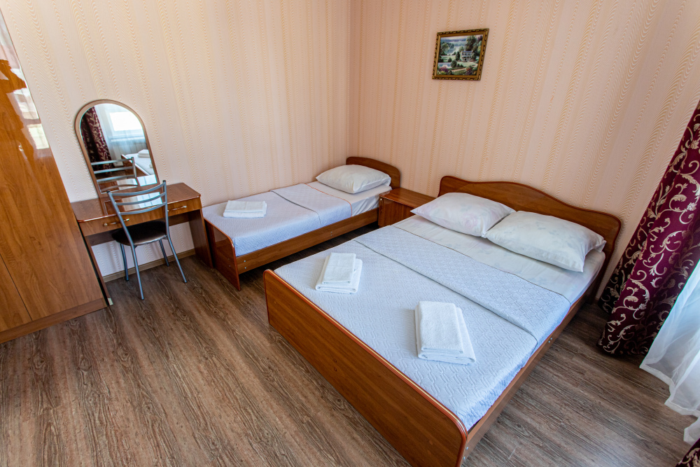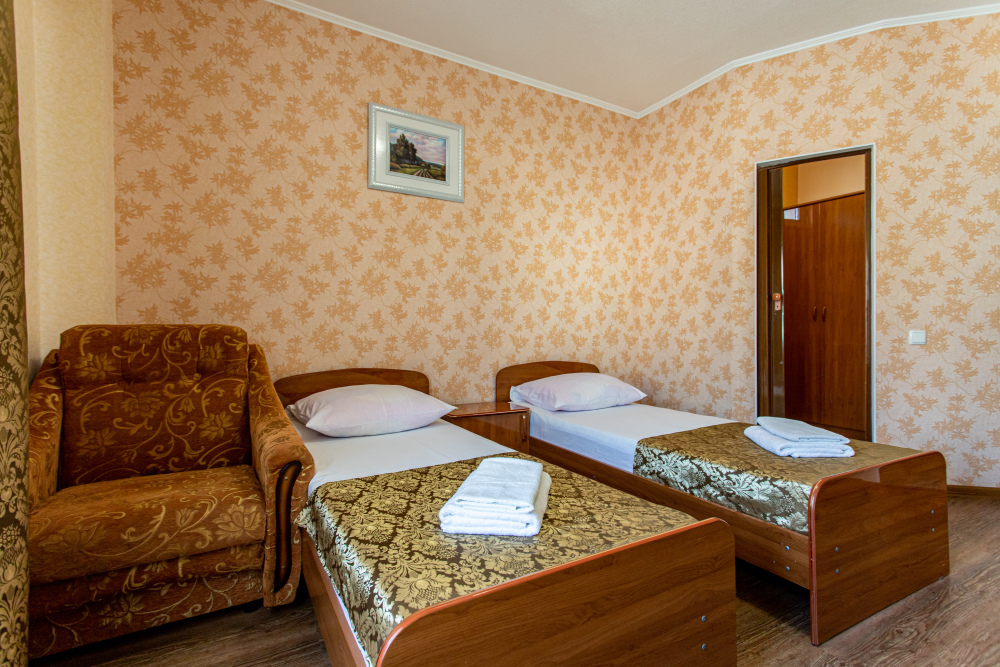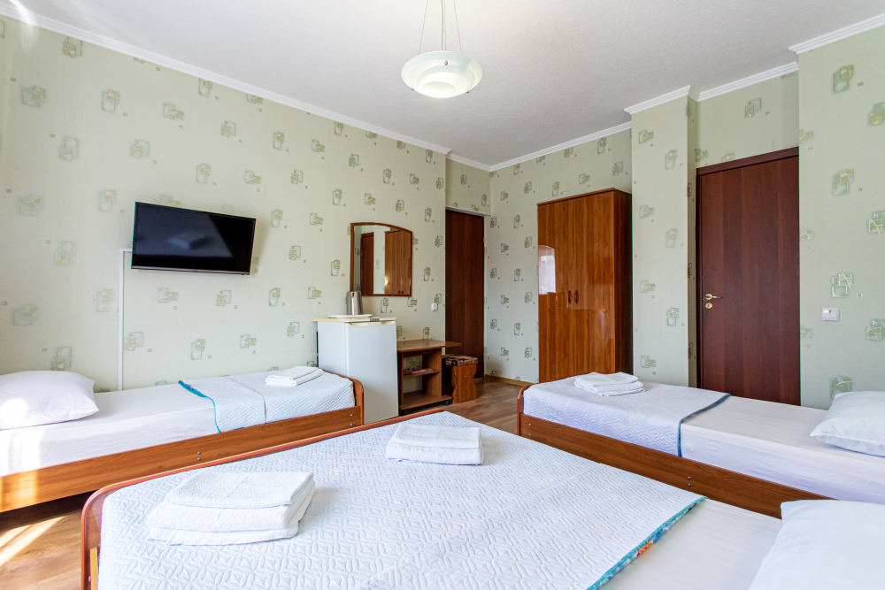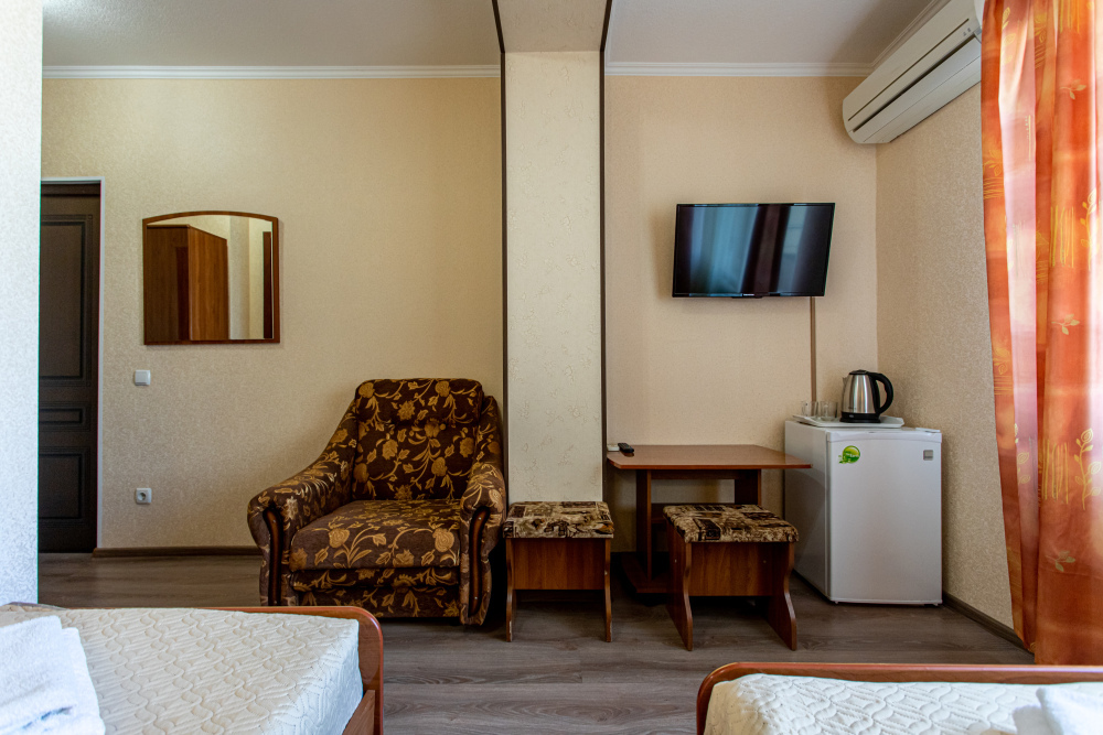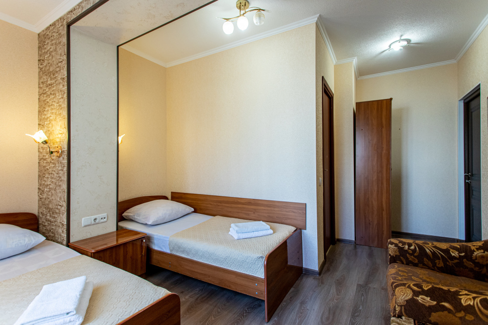 Номер меблирован 2-спальной и двумя односпальными кроватями, либо диваном (при размещении доп. места - раздвижным креслом), прикроватными тумбами, стульями, столом и шкафом для размещения гардероба.