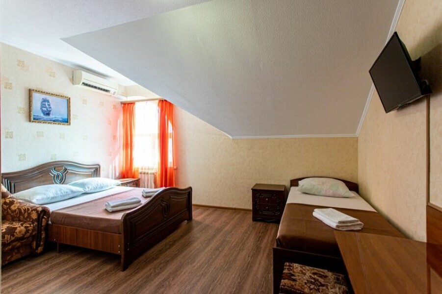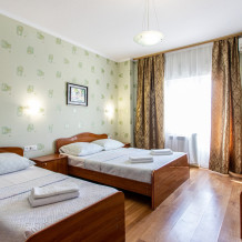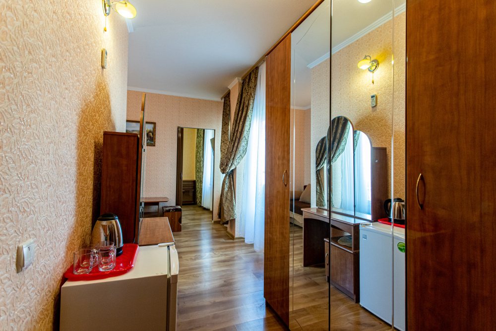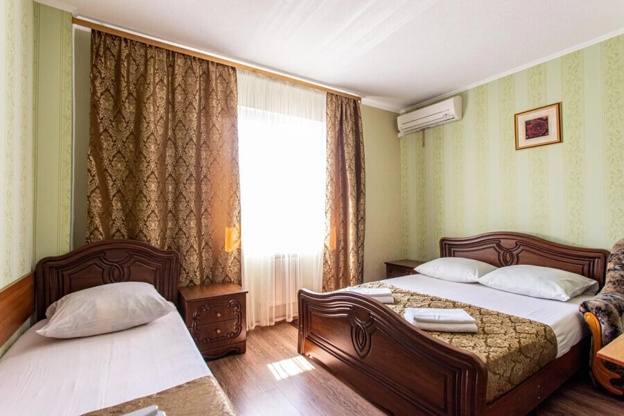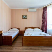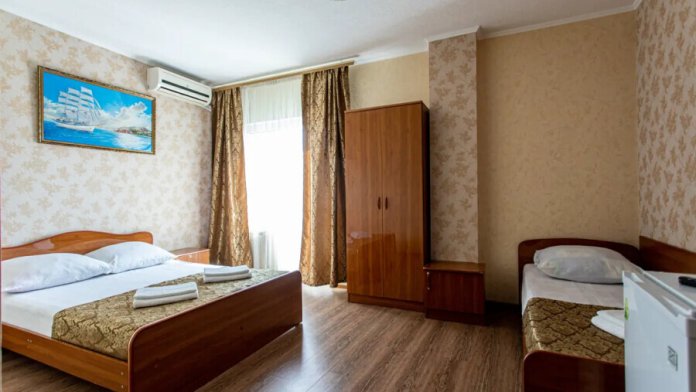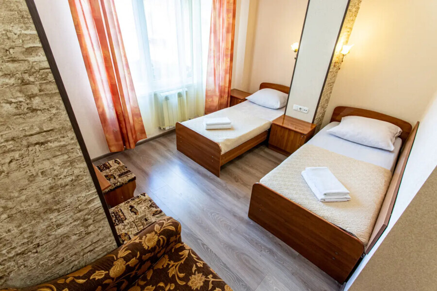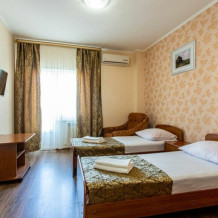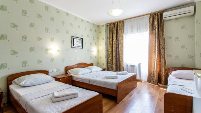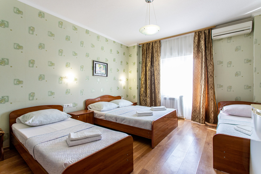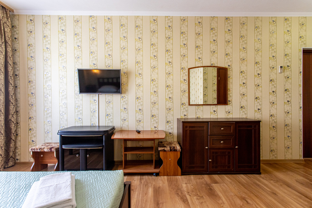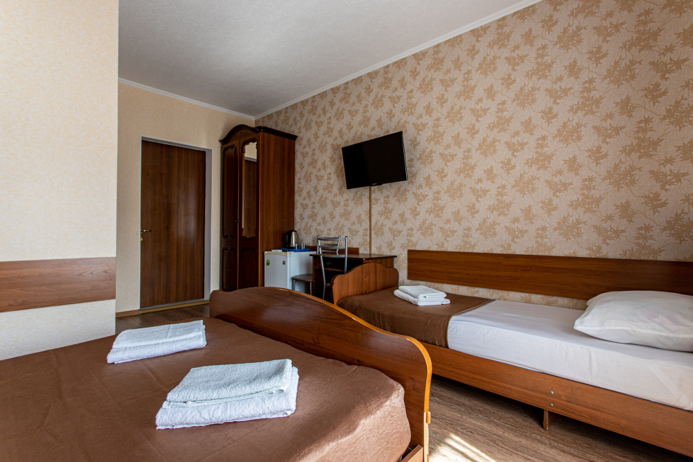 Номер меблирован 2-спальной и двумя односпальными кроватями, либо диваном (при размещении доп. места - раздвижным креслом), прикроватными тумбами, стульями, столом и шкафом для размещения гардероба.