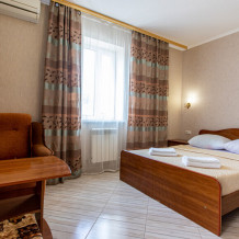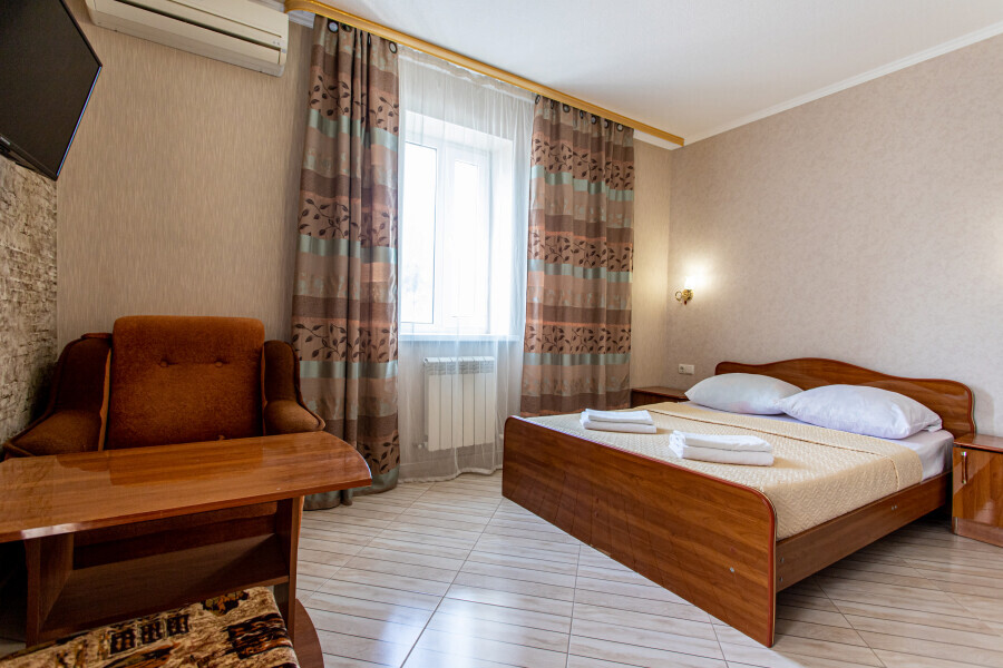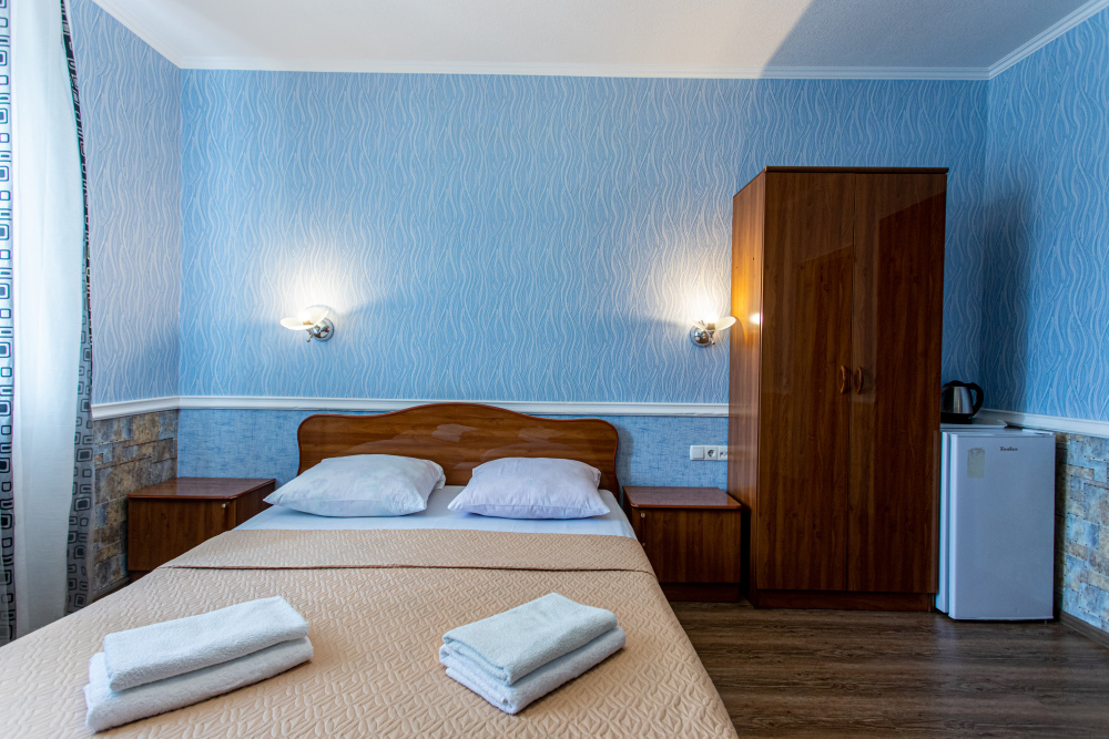 Номер меблирован 2-спальной кроватью (при размещении дополнительного места - раздвижным креслом), прикроватными тумбами, стульями, столом и шкафом для размещения гардероба.