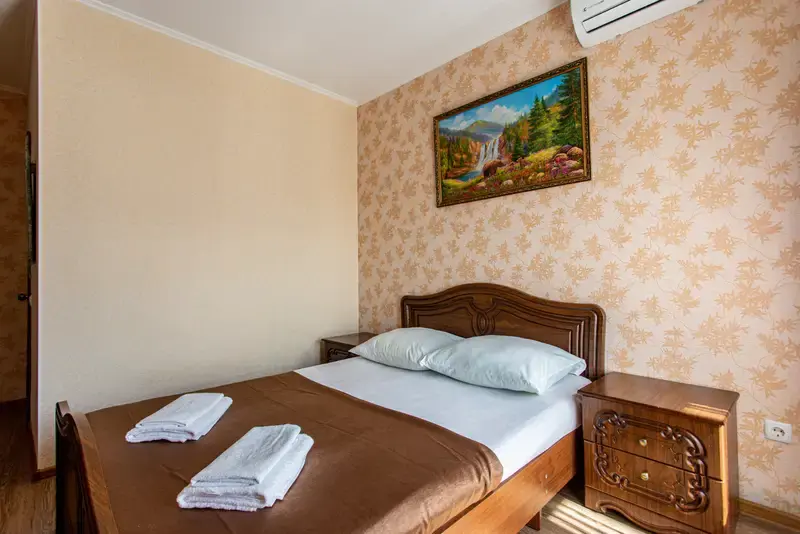 Из удобств, для комфортного проживания есть телевизор, сплит-система, чайник, холодильник. Предоставляется постельное белье, полотенца (по количеству гостей) и гигиенические принадлежности. Уборка и смена белья производится один раз в 5 суток и по требованию гостя. Вынос мусора - самостоятельный.