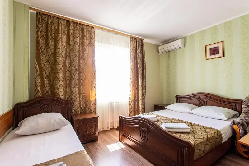 Бронировали 6ти местный двухкомнатный номер. По описанию в номере должен быть кондиционер, а по факту он есть только в одной комнате и еле-еле ее охлаждает. Во 2ой комнате нет ни окон, ни кондиционера, даже открыв дверь между комнатами во 2ой комнате очень душно и жарко. В добавок номер находится под крышей и во 2ой комнате прямо над кроватью огромное глухое панорамное окно, соответственно помимо жары и солнцепека, спать получилось только до рассвета. Плюс постоянный уонтроль и жесткие рамки со стороны администрации. Чтобы попасть на стоянку в машину, нужно звонить, искать и ждать пока администатор освободиться. В бассейне свет отключают и начинают сыпать хлорку ровно в 23.00, не обращая внимания, что в ьассейне еще плавают взрослые и дети. В итоге мы переночевали ночь, а утром переехали в другую гостинницу. За более меньшую сумму и без надзирателя.