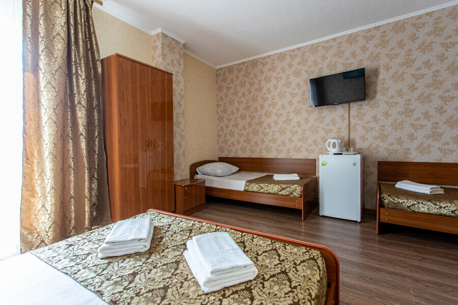 Номер меблирован 2-спальной и одной односпальной кроватью (при размещении дополнительного места - раздвижным креслом), прикроватными тумбами, стульями, столом и шкафом для размещения гардероба.