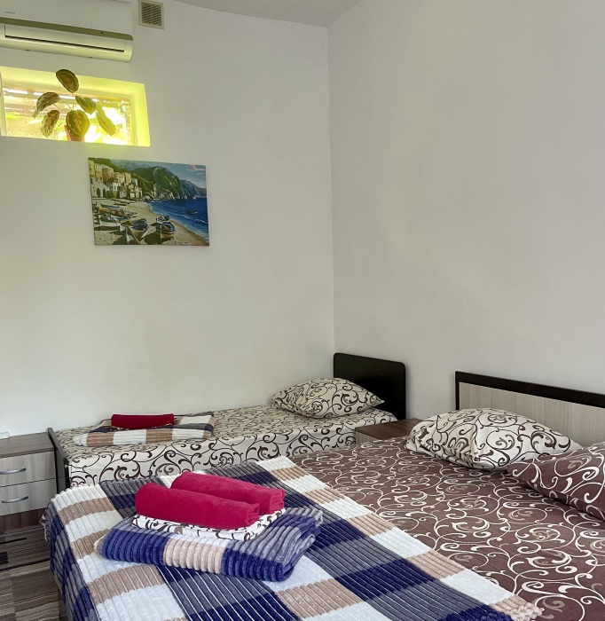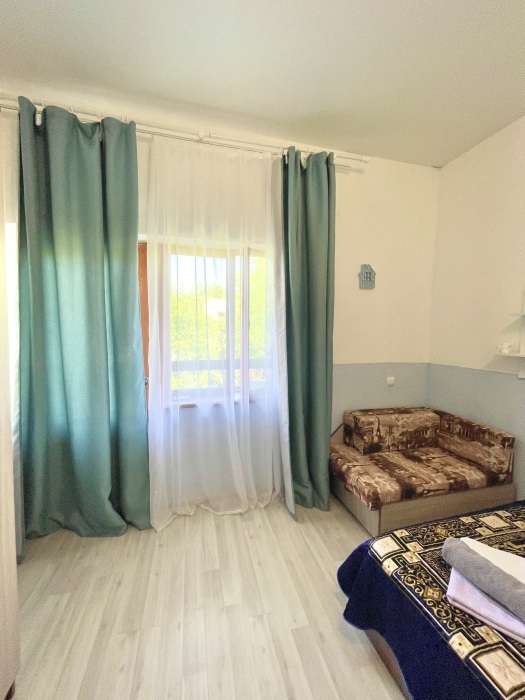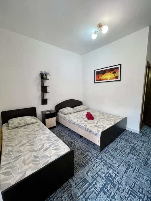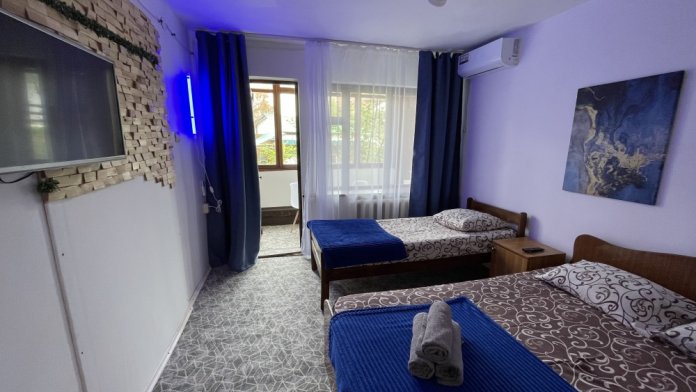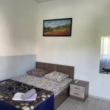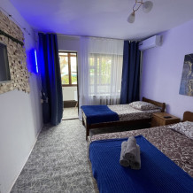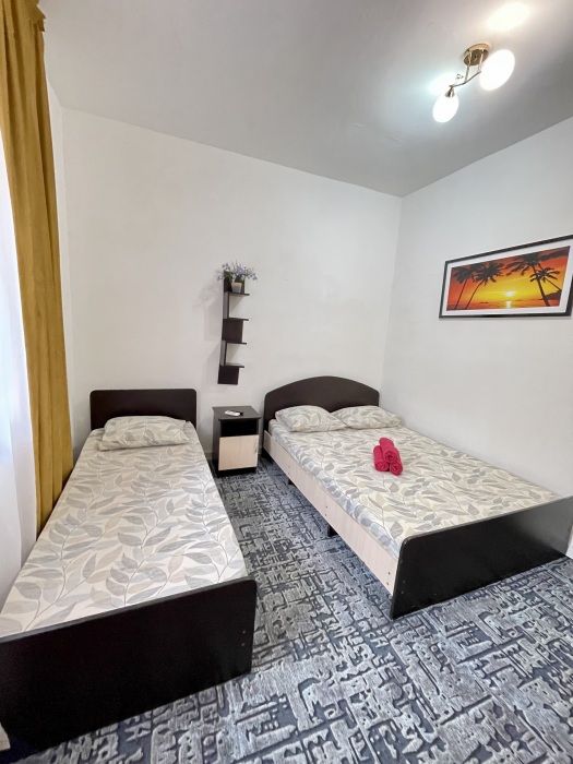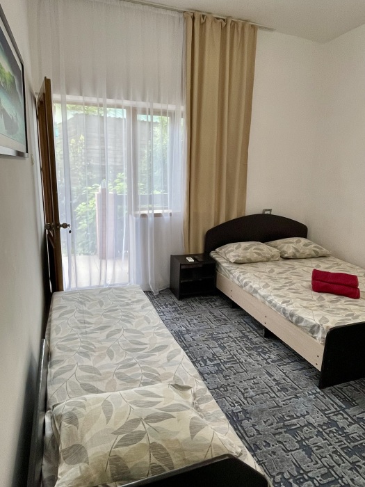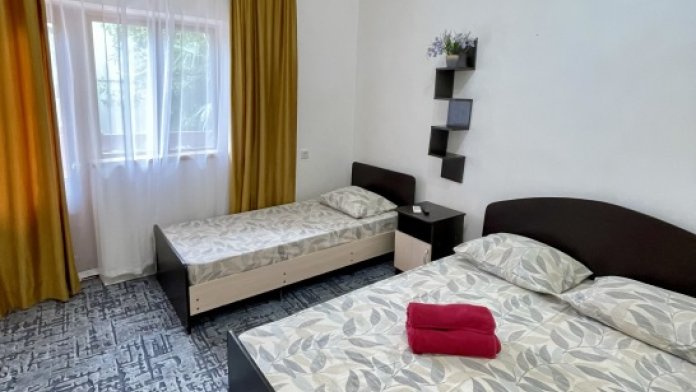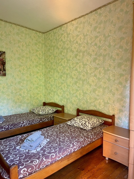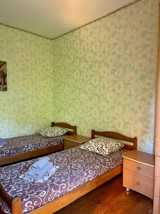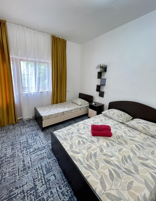 Крыло под ключ для большой семьи или двух пар. Это отдельный вход и две отдельные комнаты соединены коридором. В каждой комнате двухспальная кровать, односпальная, тв, сплит-система, балкон. Удобства на эти 2 комнаты: душ, туалет, холодильник, фен, электрочайник, и вай-фай.