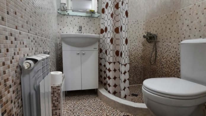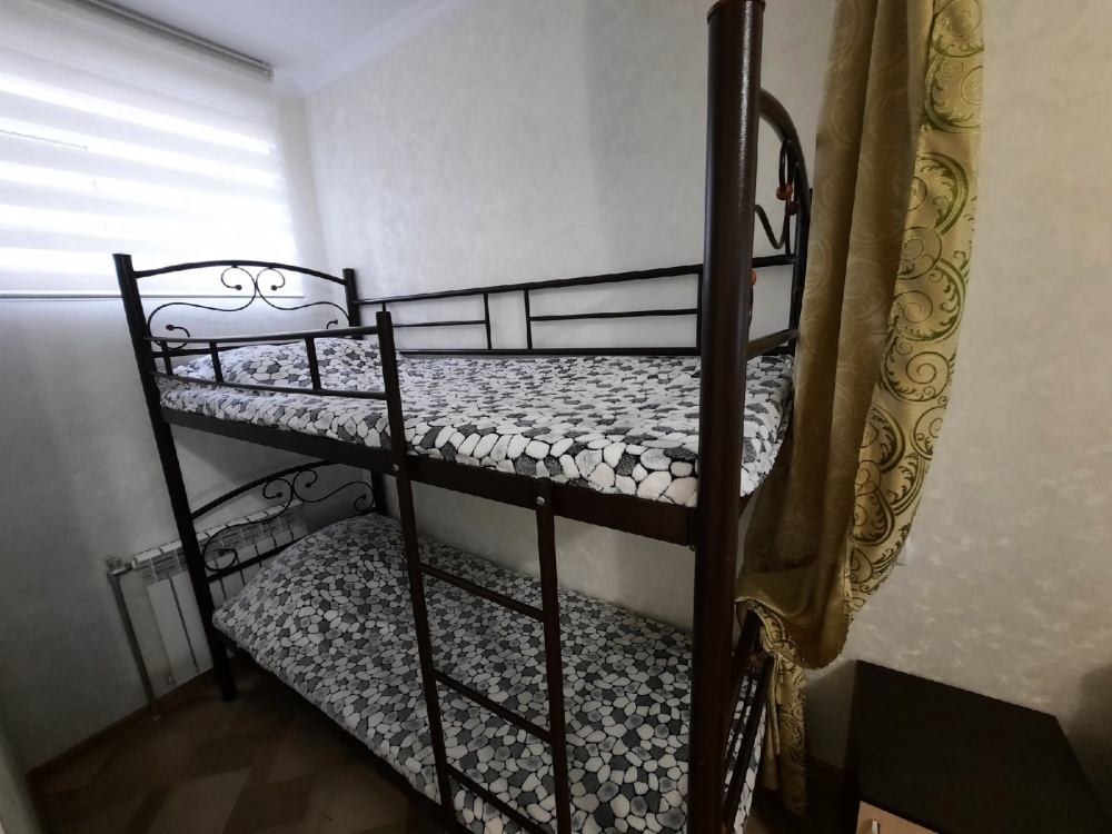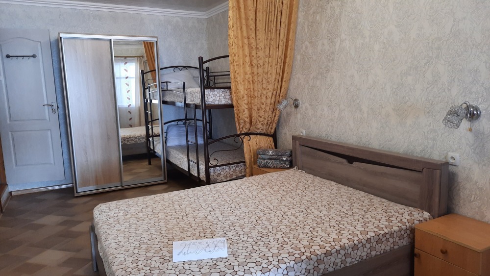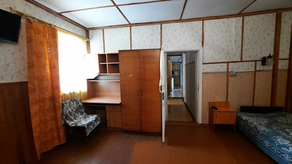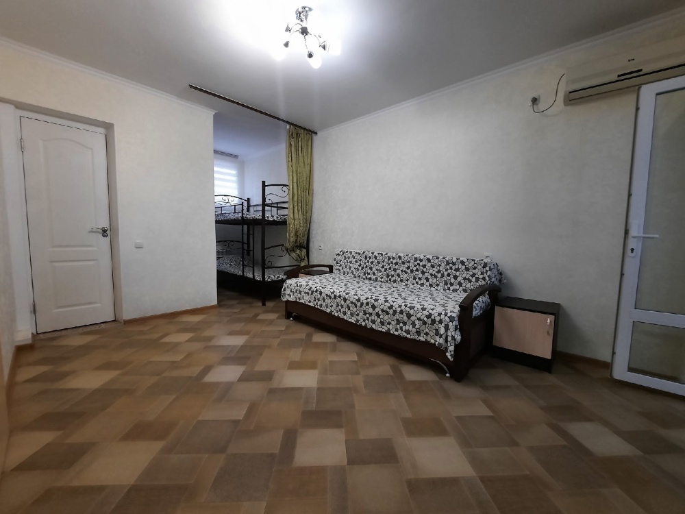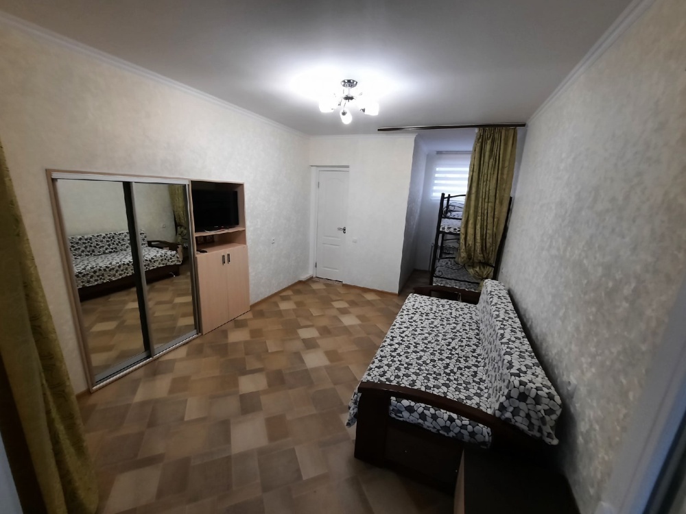В спальне встроенный шкаф-купе, телевизор, кондиционер, раскладной двуспальный диван, двухъярусная кровать, Wi-Fi. Совмещённый санузел находится в номере.