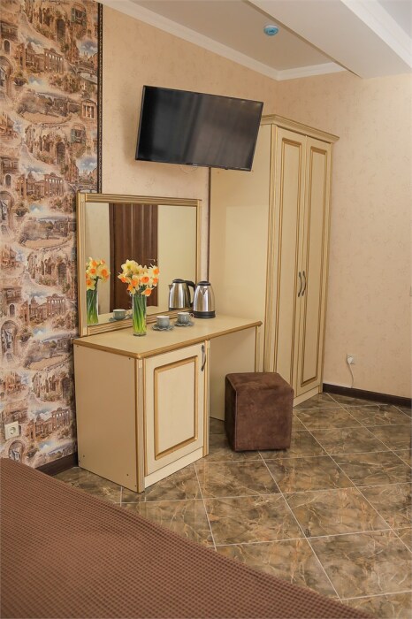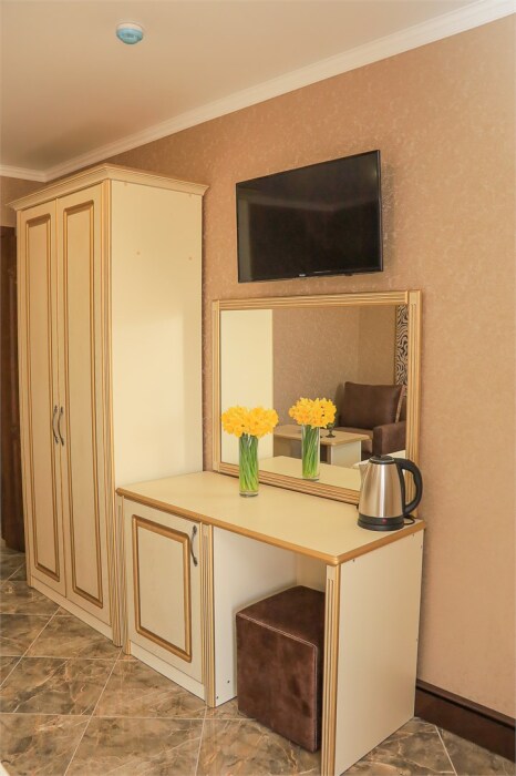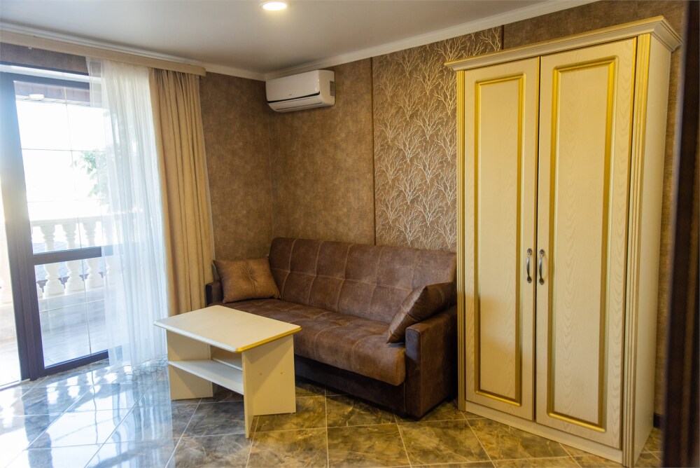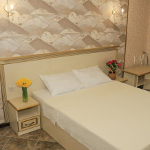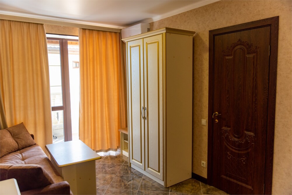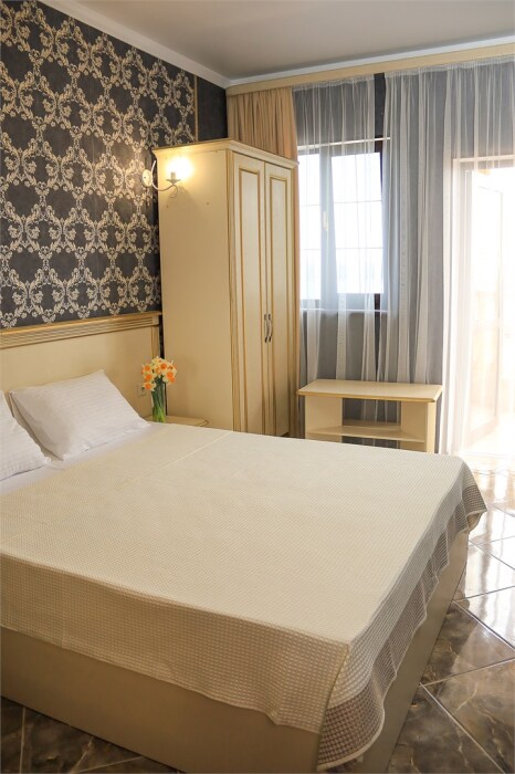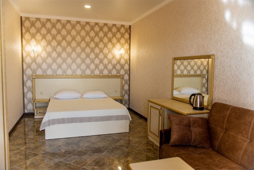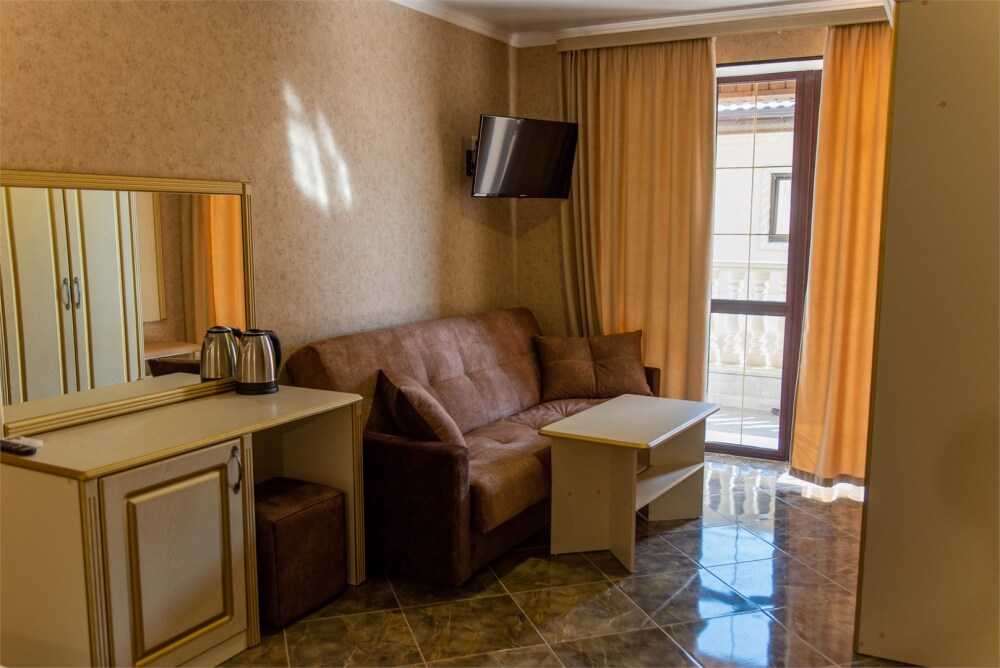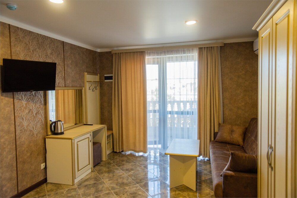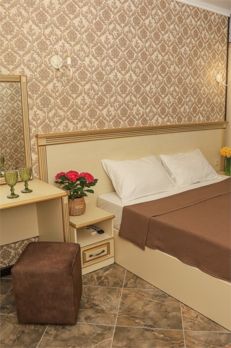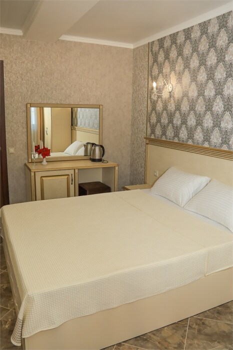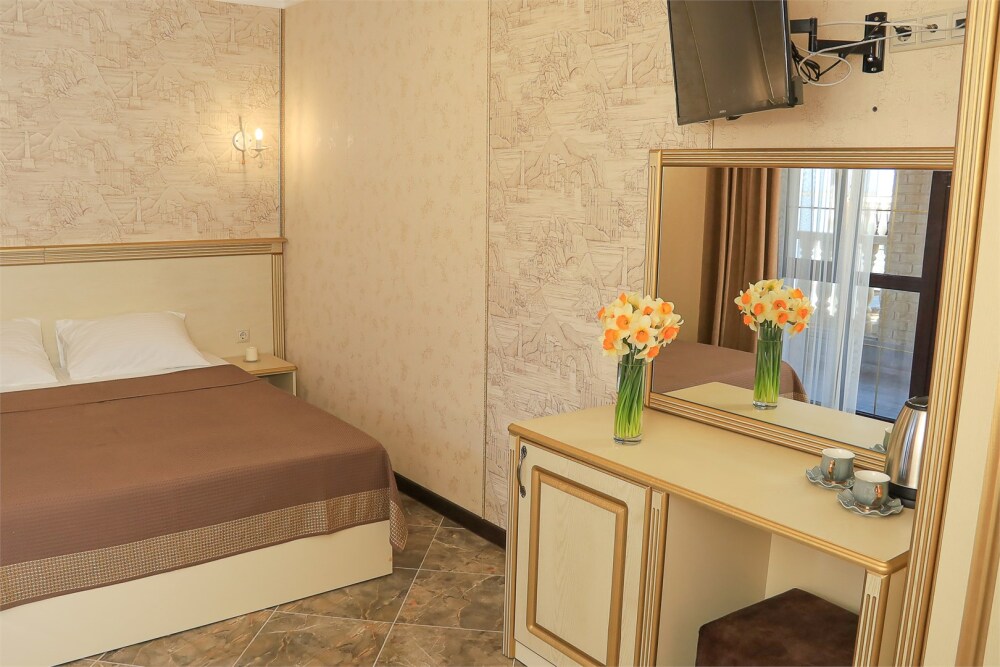 Уютный номер для 1–2 человек, площадью от 20 до 24 м². В комнате: большая кровать, рабочая зона, телевизор, чайник, шкаф. В ванной — душ, фен, туалет, полотенца. Есть кондиционер, Wi-Fi. На этаже — утюг и гладильная доска. Стойка регистрации работает круглосуточно. Уборка — раз в 3 дня, смена белья — раз в 5 дней. Завтрак с 8:00 до 10:00 (дополнительно). В ресторане действует дневное меню. Бесплатно: прачечная, хранение багажа, парковка. Сувениры из Крыма на территории. Дети до 3 лет — бесплатно.