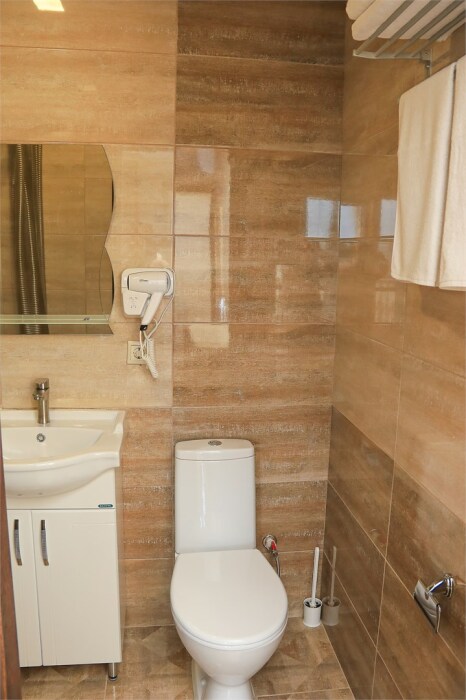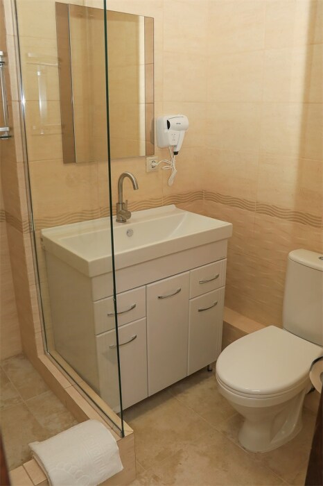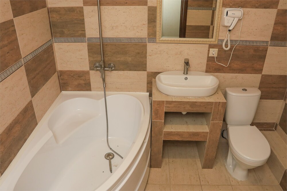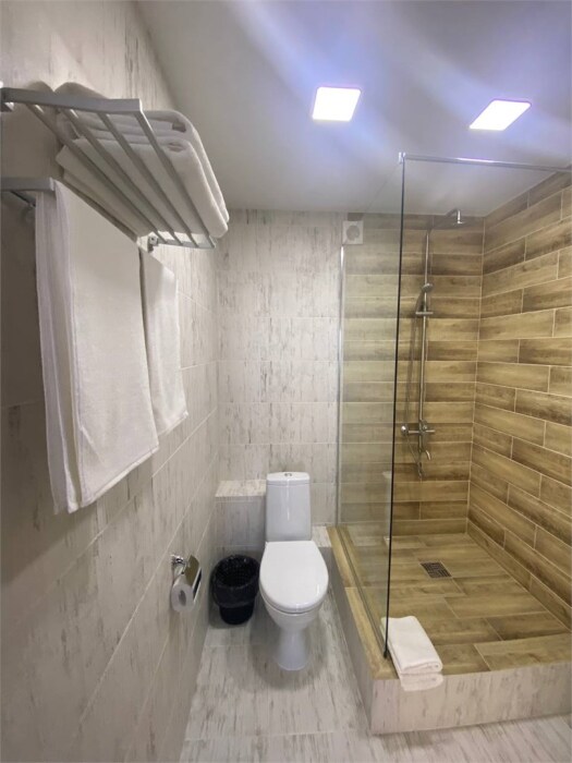 Однокомнатный улучшенный номер для 2–4 человек. В номере: большая кровать, раскладной диван, рабочая зона, чайник, телевизор, шкаф. В ванной — душ, фен, туалет, полотенца. Есть кондиционер и бесплатный Wi‑Fi. Утюг с гладильной доской — на этаже. Один ребёнок до 6 лет — можно без отдельного спального места.