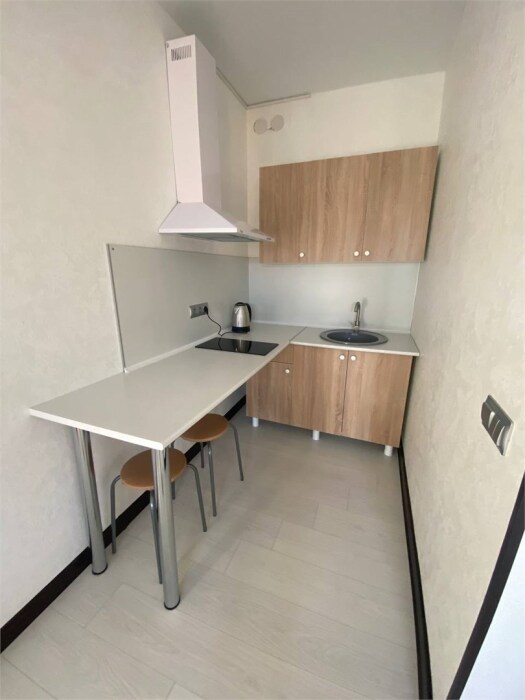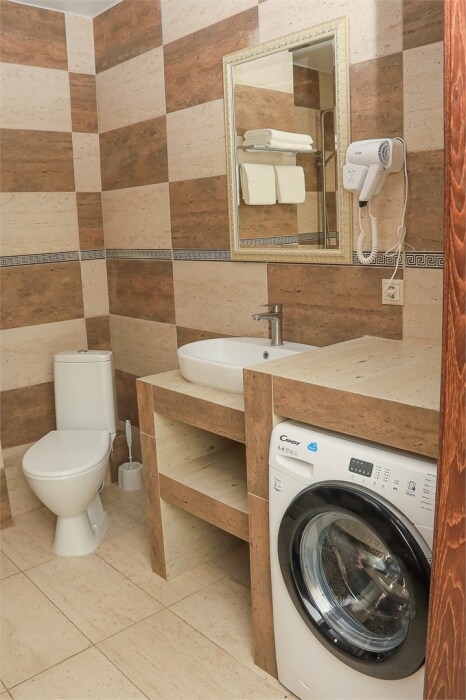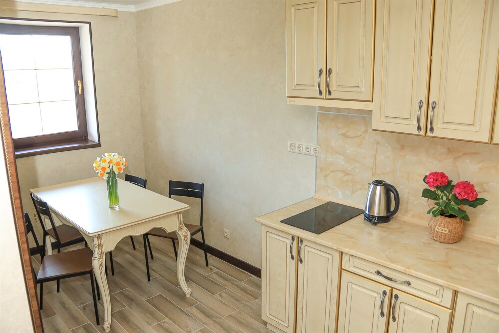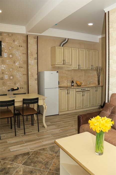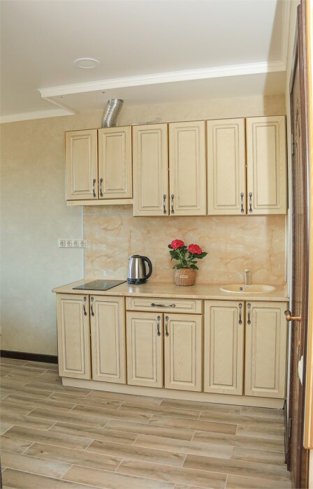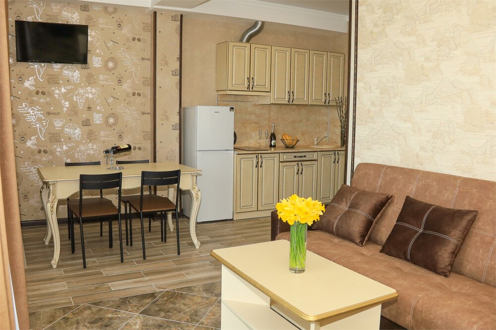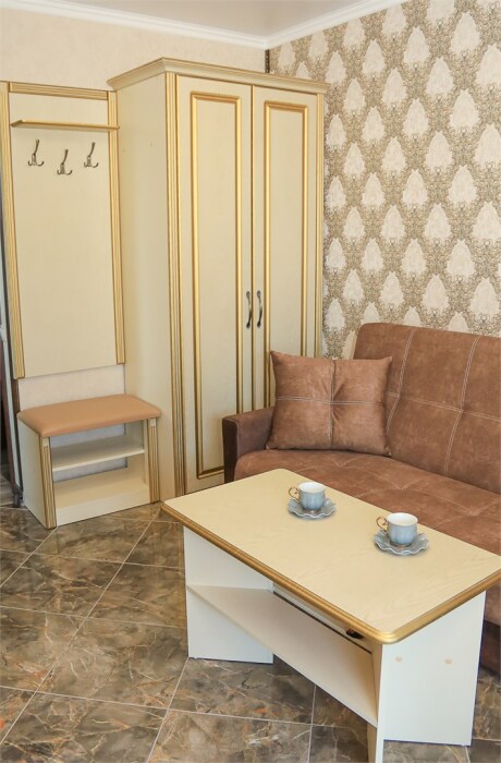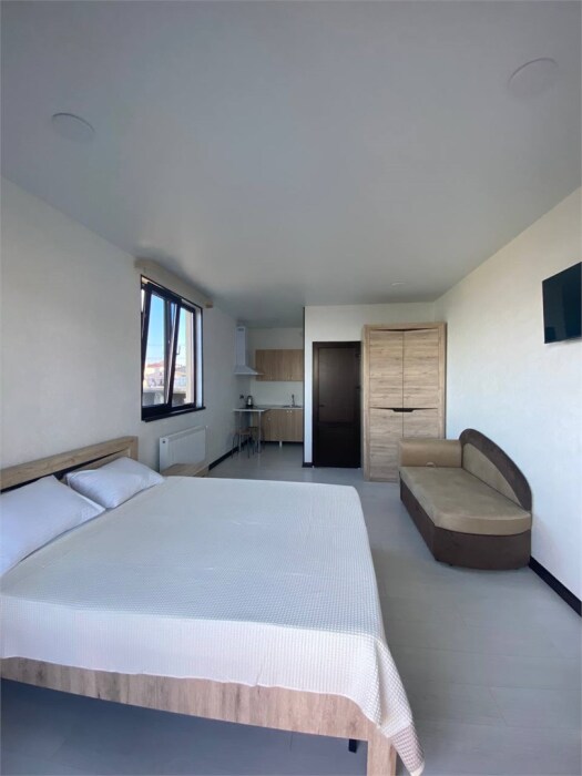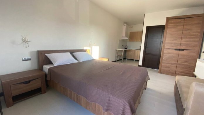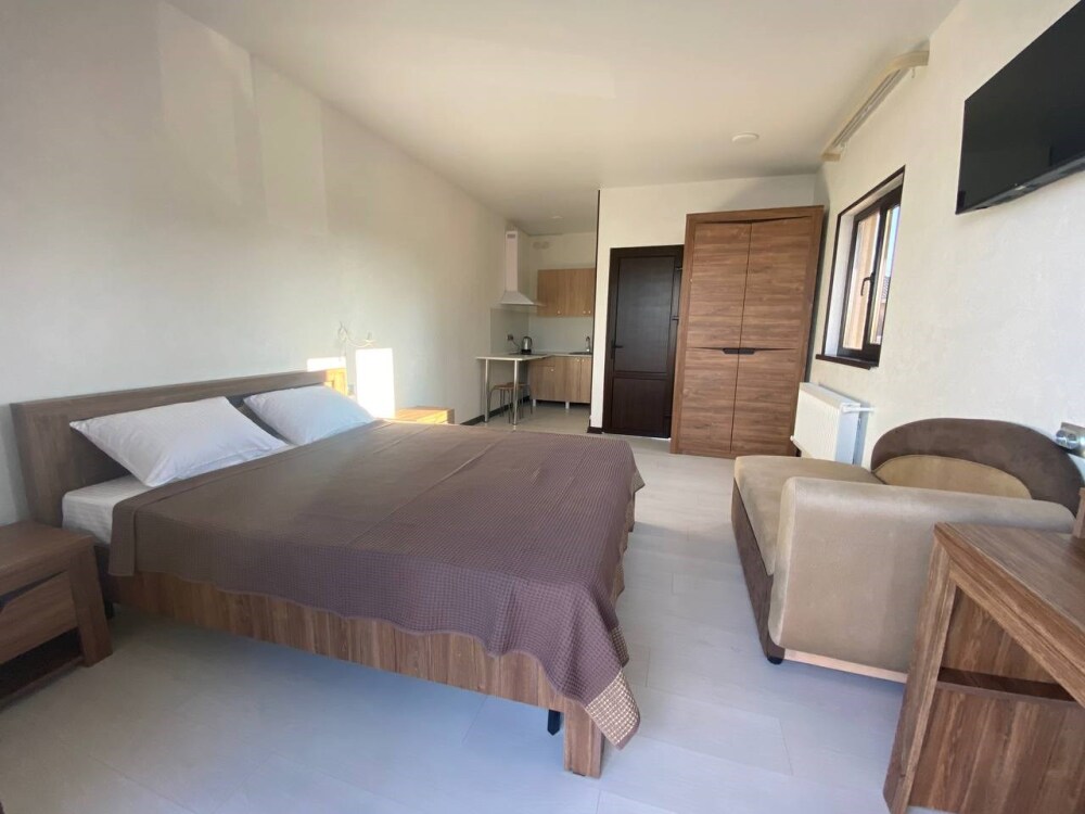 Уютная студия для 2–3 человек, площадью 20–30 м2. В номере: большая кровать, раскладное кресло, кухня с посудой, холодильник, чайник, обеденная зона, телевизор, шкаф. В ванной — душ, фен, санузел, полотенца. Есть кондиционер, бесплатный Wi‑Fi. Утюг и гладильная доска — на этаже.