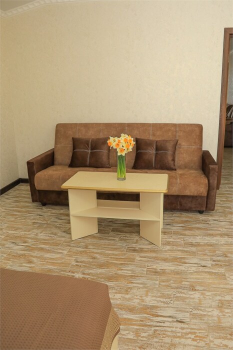 Просторный VIP-номер с отдельной спальней и гостиной с кухонной зоной. Идеален для семьи из 2–4 человек. В номере: большая кровать, 2 раскладных дивана, кухня, обеденная зона, посуда, холодильник, чайник, телевизор. В ванной — ванна, фен, санузел, полотенца. Кондиционер, Wi‑Fi.