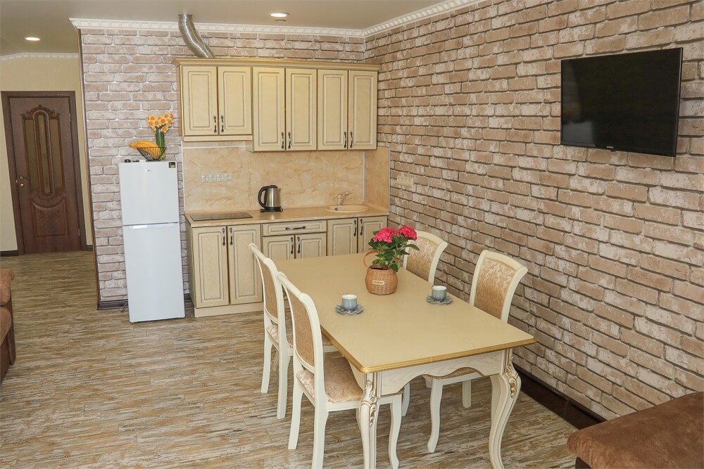 Семейный номер с двумя комнатами — спальней и гостиной с кухонной зоной. Отличный выбор для 2–4 человек. В спальне — большая кровать, в гостиной — раскладной диван, обеденная зона, кухня, холодильник, посуда, чайник, телевизор, шкаф. В ванной — душ, фен, санузел, полотенца. Кондиционер, бесплатный Wi‑Fi. Один ребёнок до 6 лет — можно без отдельного спального места.