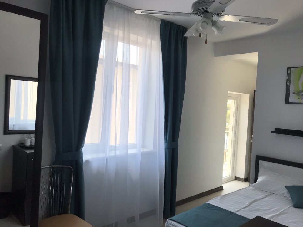 Номер с двуспальной кроватью, балконом, санузлом для двух человек. Имеется холодильник, чайник, кондиционер, белое белье, полотенца, ТВ.