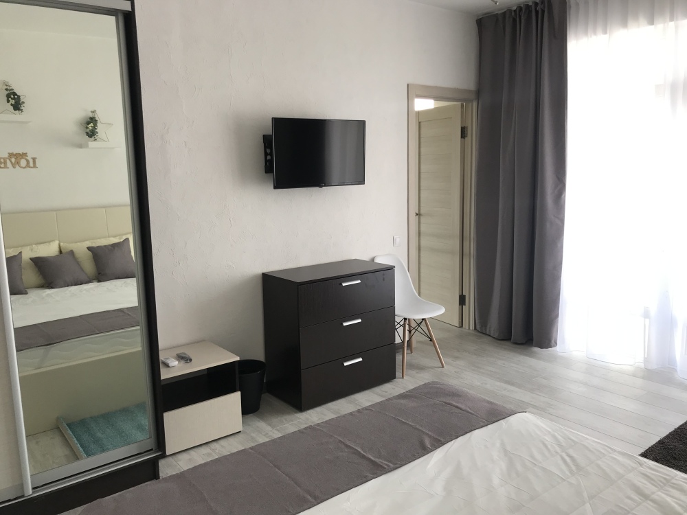 Шикарный номер для двоих. Стильный интерьер, белое белье, полотенца, ТВ с плоским экраном, кондиционер, холодильник, чайник.