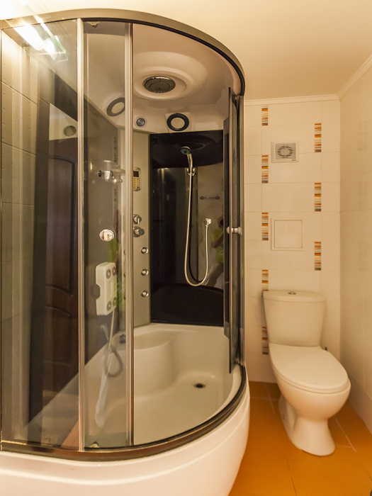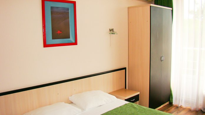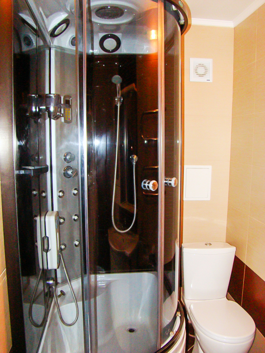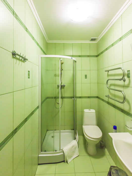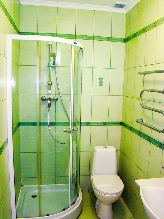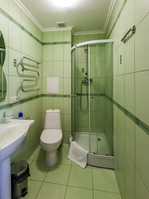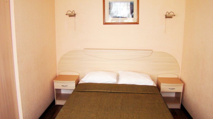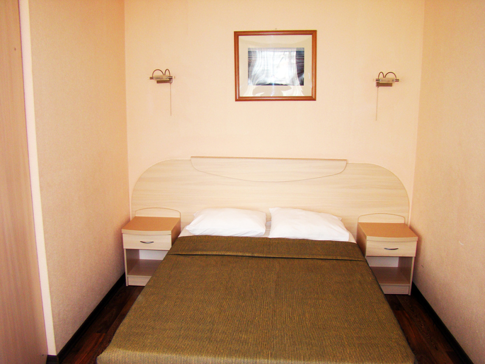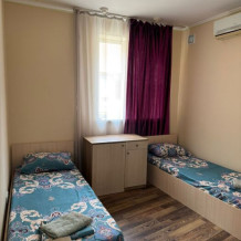 В номере две французские кровати односпальные, прикроватные тумбочки, шкаф, столик, пуфик, телевизор, мини-холодильник, сплит-система. Санузел совмещенный, раковина, душевая кабина.