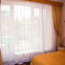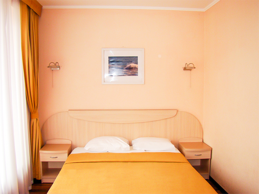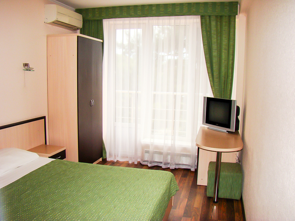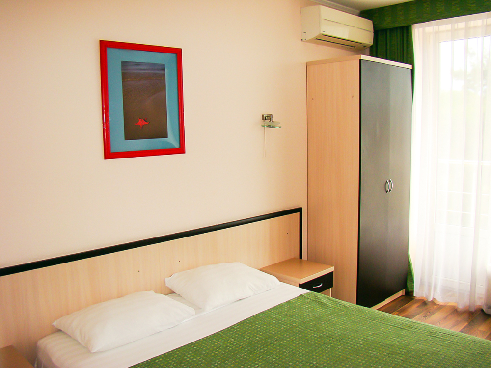 В номере две французские кровати односпальные, прикроватные тумбочки, шкаф, столик, пуфик, телевизор, мини-холодильник, сплит-система. Санузел совмещенный, раковина, душевая кабина. Номер с балконом.