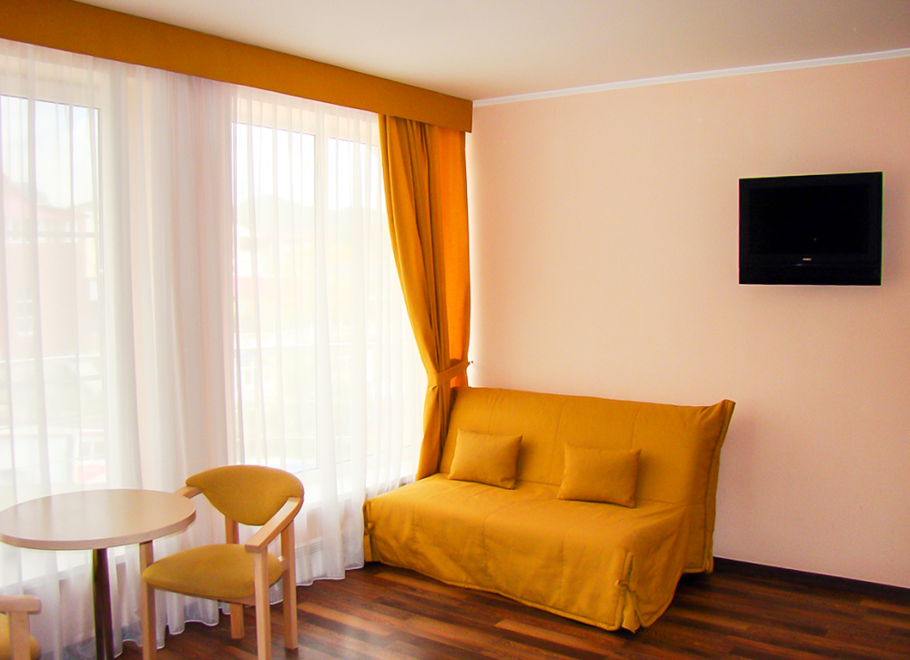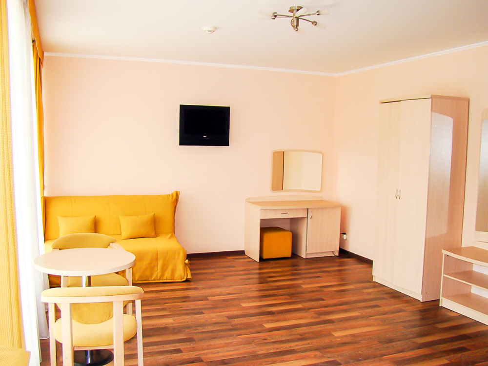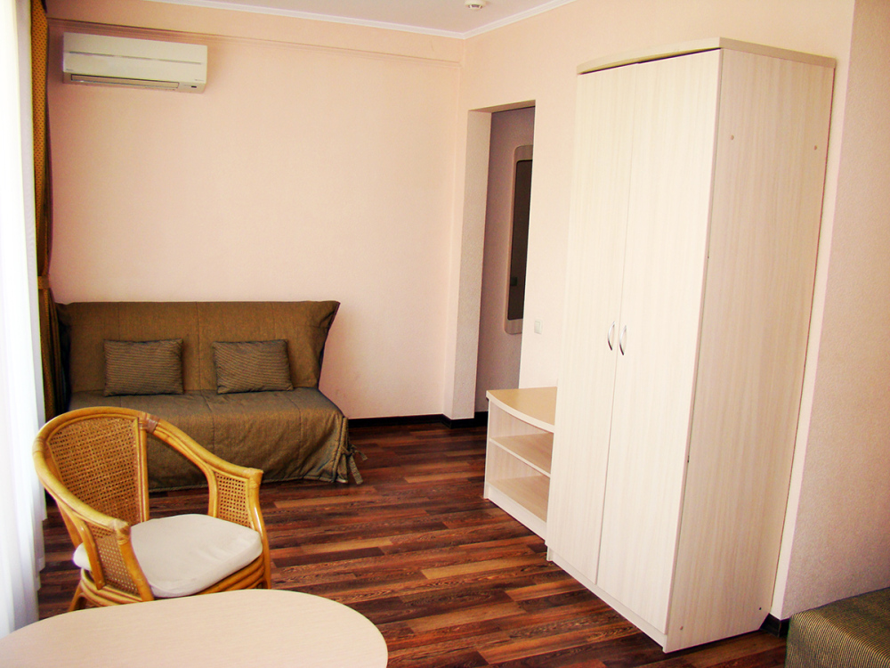 В номере одна французская кровать двуспальная, прикроватные тумбочки, шкаф, столик с зеркалом, пуфик, раскладной диван, телевизор, мини-холодильник, сплит-система, журнальный столик, два кресла. Санузел совмещенный, раковина, душевая кабина с гидромассажем. Номер однокомнатный.