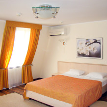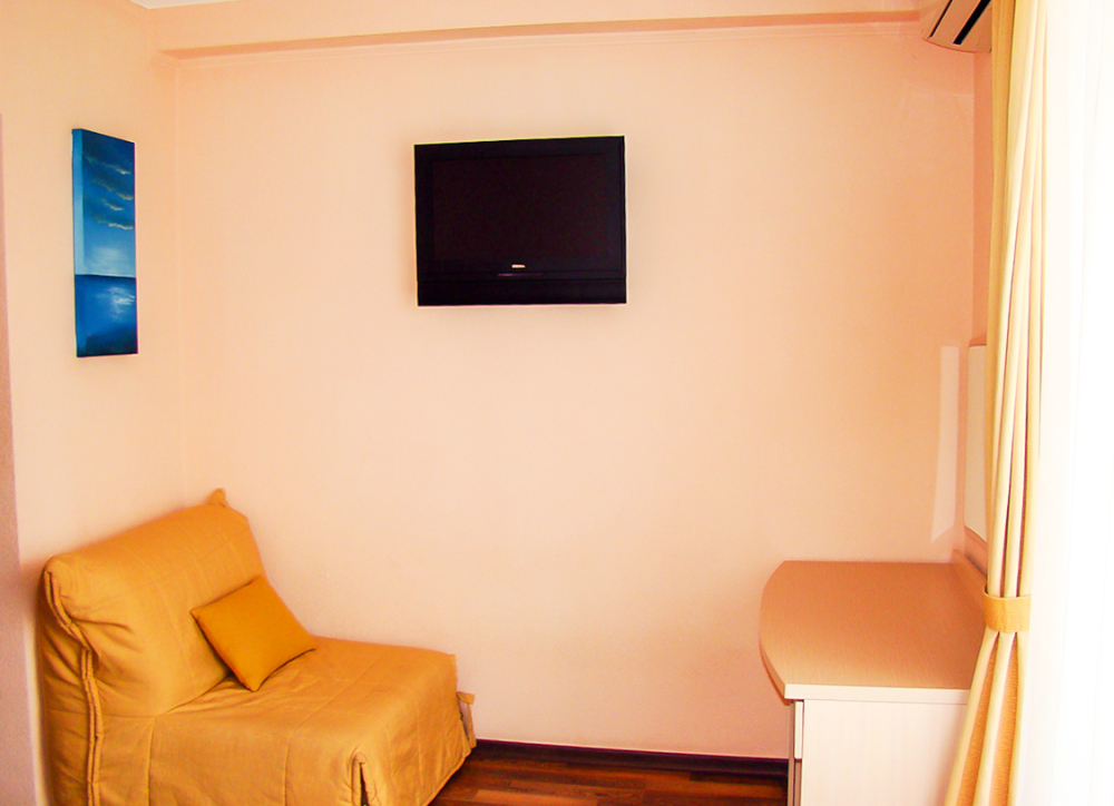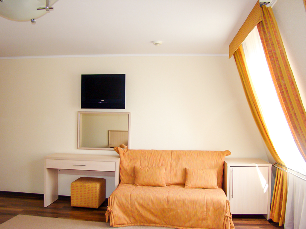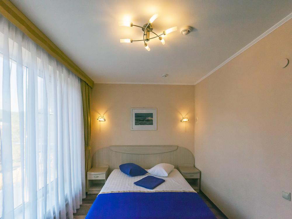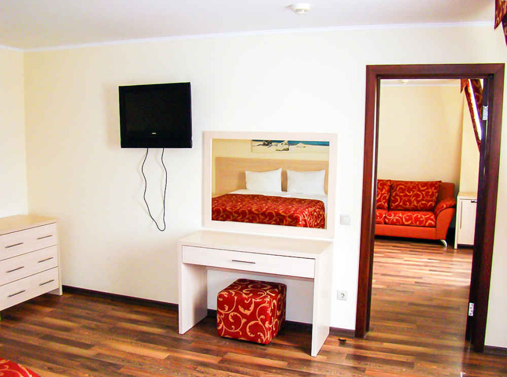 В номере одна французская кровать двуспальная, прикроватные тумбочки, шкаф, столик с зеркалом, пуфик, раскладной диван-кровать односпальный, телевизор, мини-холодильник, сплит-система. Санузел совмещенный, раковина, душевая кабина.