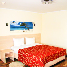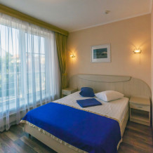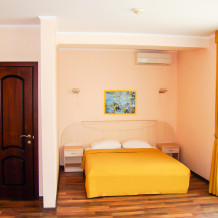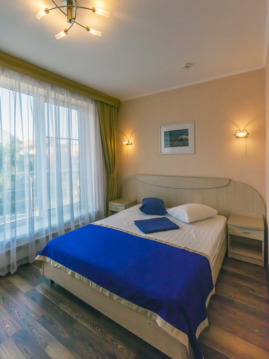В номере одна французская кровать двуспальная, прикроватные тумбочки, шкаф, столик с зеркалом, пуфик, раскладной диван-кровать двуспальный, телевизор, мини-холодильник, сплит-система. Санузел совмещенный, раковина, душевая кабина. Номер с балконом.