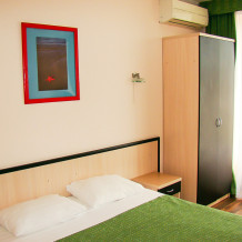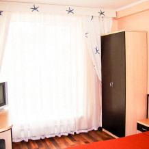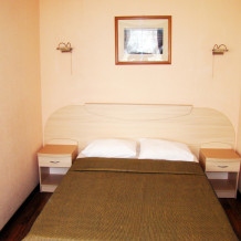 Двухместный номер Эконом с витражными окнами. В номере двуспальная кровать или две односпальные, тумба, стул, сплит-система, холодильник. Общие удобства на этаже для 13 человек.
