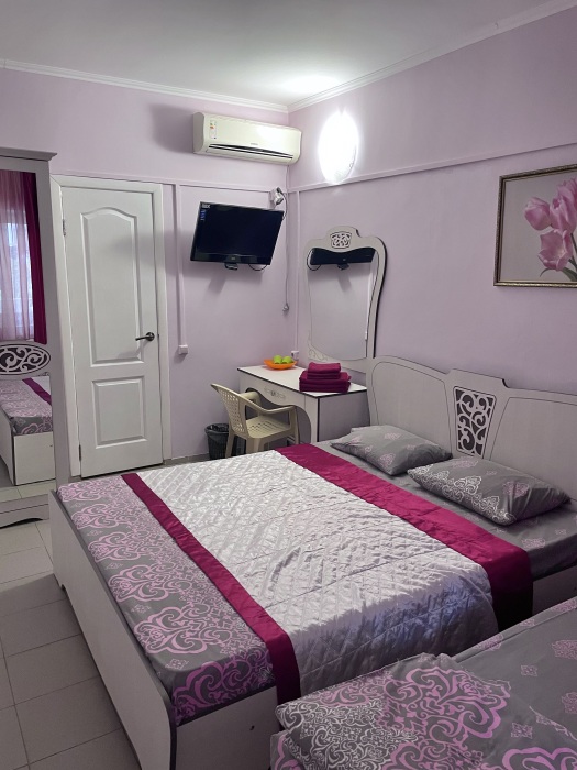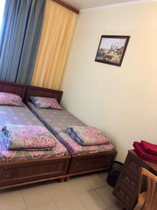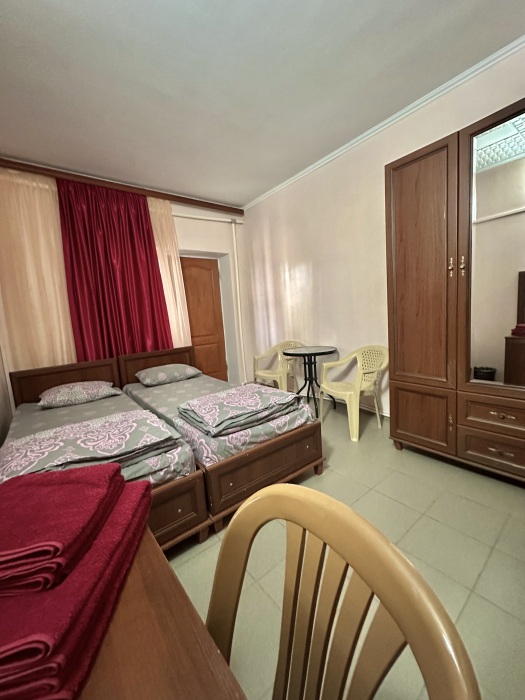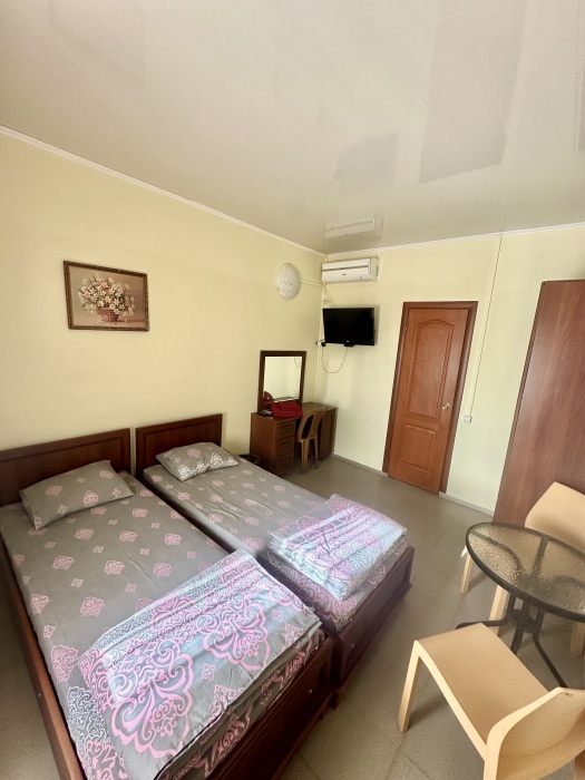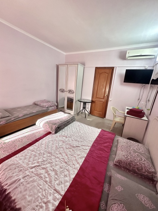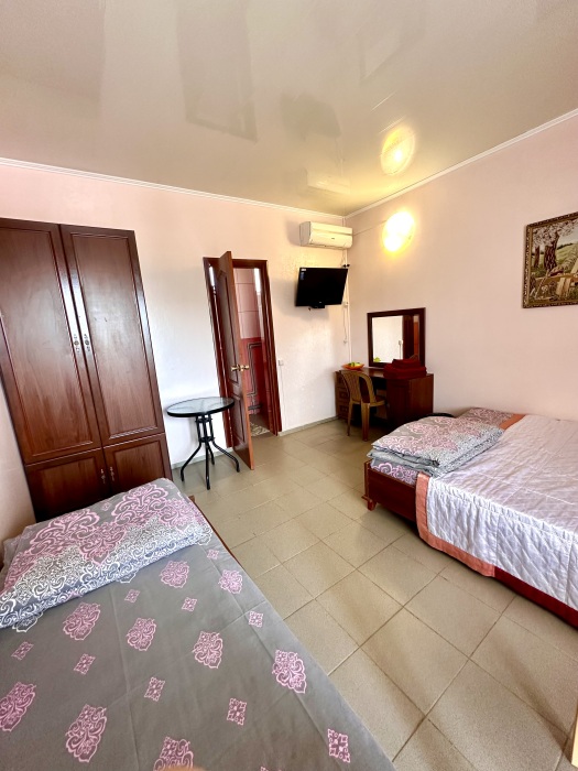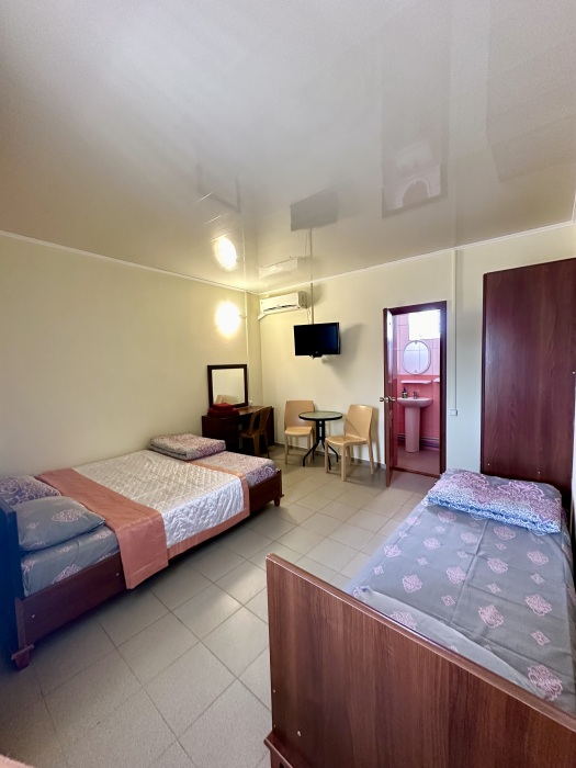 Уютный номер, рассчитан на размещение 3 гостей. В номере есть все необходимое для комфортного проживания: удобная двуспальная кровать и односпальная, прикроватные тумбочки, шкаф для одежды, туалетный столик, С/У с душем.