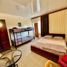 Уютный семейный номер, рассчитан на размещение 4 гостей. В номере есть все необходимое для комфортного проживания: удобная двуспальная кровать и двухярусная кровать, прикроватные тумбочки, шкаф для одежды, туалетный столик, С/У с душем.