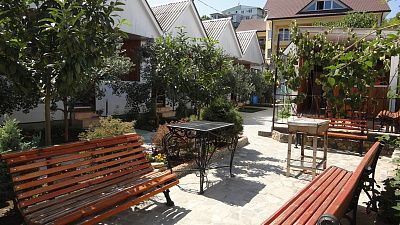На территории, для удобства наших постояльцев, мы оборудовали беседками места для отдыха, бассейн, а утопающий в зелени двор спасет Вас от летнего зноя. На территории работает Wi-Fi интернет. Для маленьких гостей у нас есть хорошо оборудованная детская площадка. Любителям шашлычка - мангал и шампуры. А также Вы можете заказать вкусный и сочный шашлык у нас. Для самостоятельного приготовления пищи есть кухня со всем необходимым. Ну, а для прибывших к нам на отдых туристов на личном авто во дворе и перед домом предусмотрена парковка.