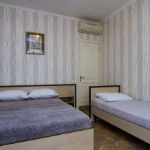 Для размещения отдыхающих мы всегда рады предложить Вам по домашнему уютные, просторные 2,3,4-местные номера со всеми удобствами категории «Стандарт». А также у нас есть номера с балконами (наличие балкона в номере, пожалуйста уточняйте при предварительном бронировании). Во всех наших номерах есть все необходимое для комфортного отдыха и проживания: новая современная мебель, сплит-система, телевизор и холодильник, Wi-Fi интернет, отдельный санузел (душ, туалет, раковина).