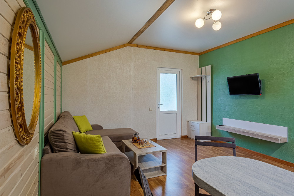 Гостиная представлена диваном-кроватью, журнальным столиком, обеденным столом и TV с многоканальным телевидением на 300 каналов.