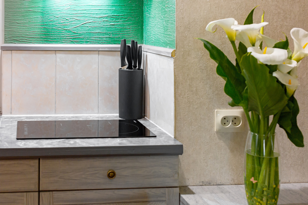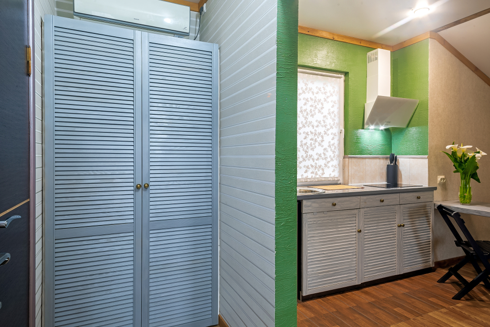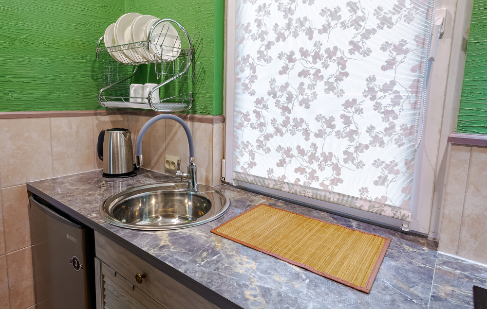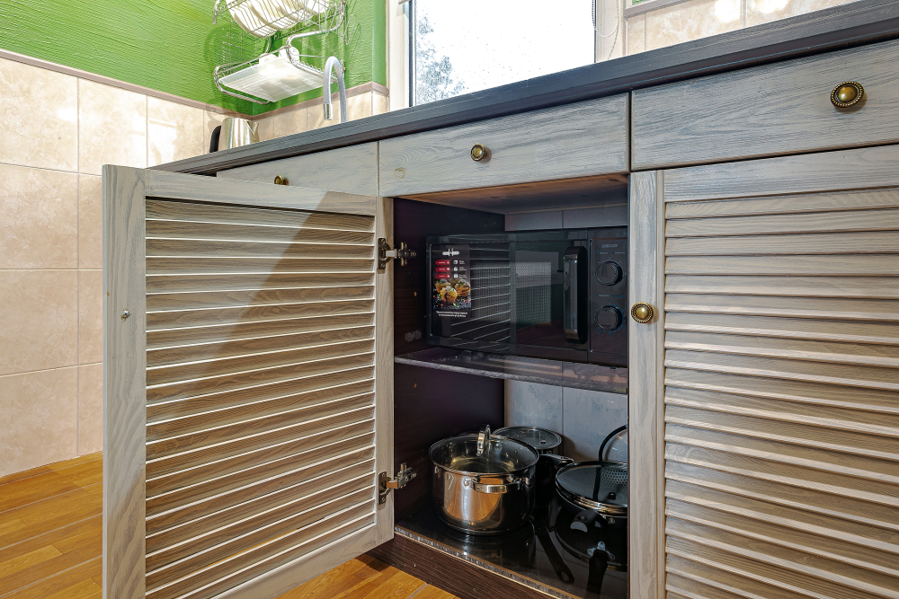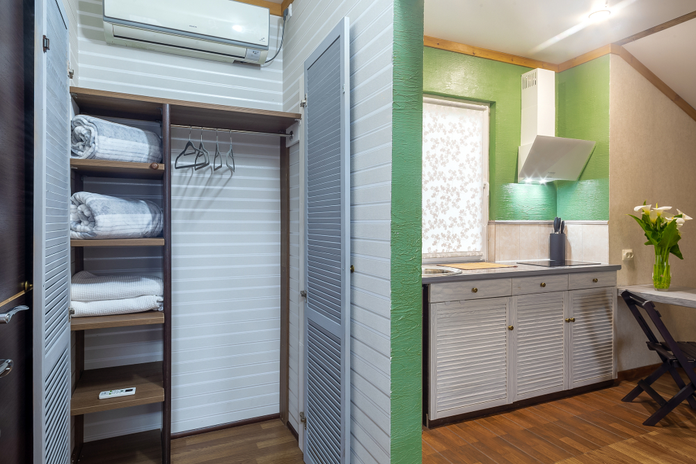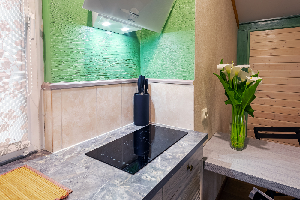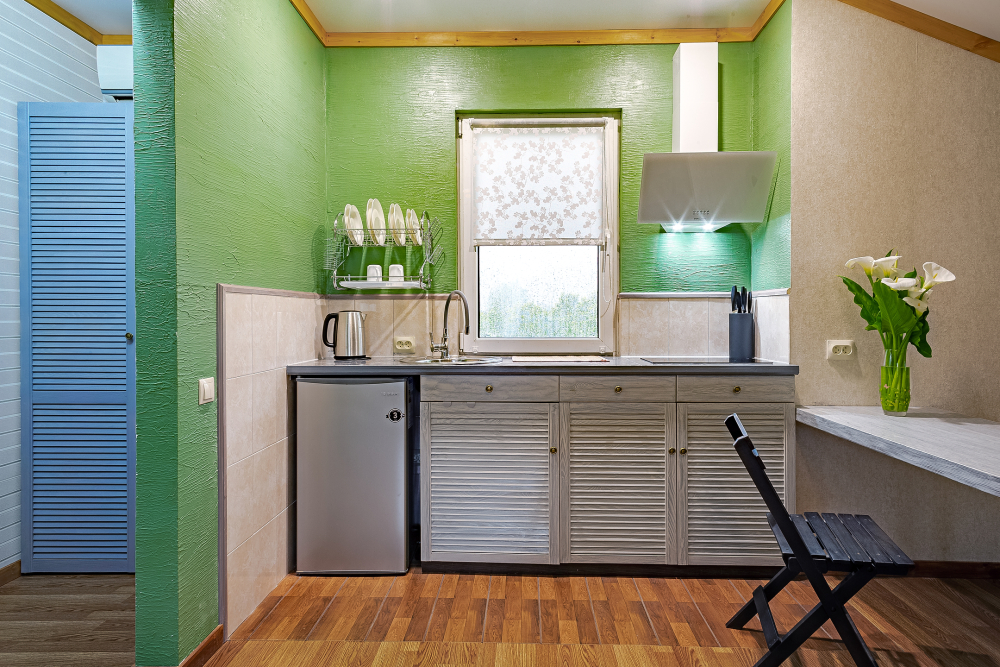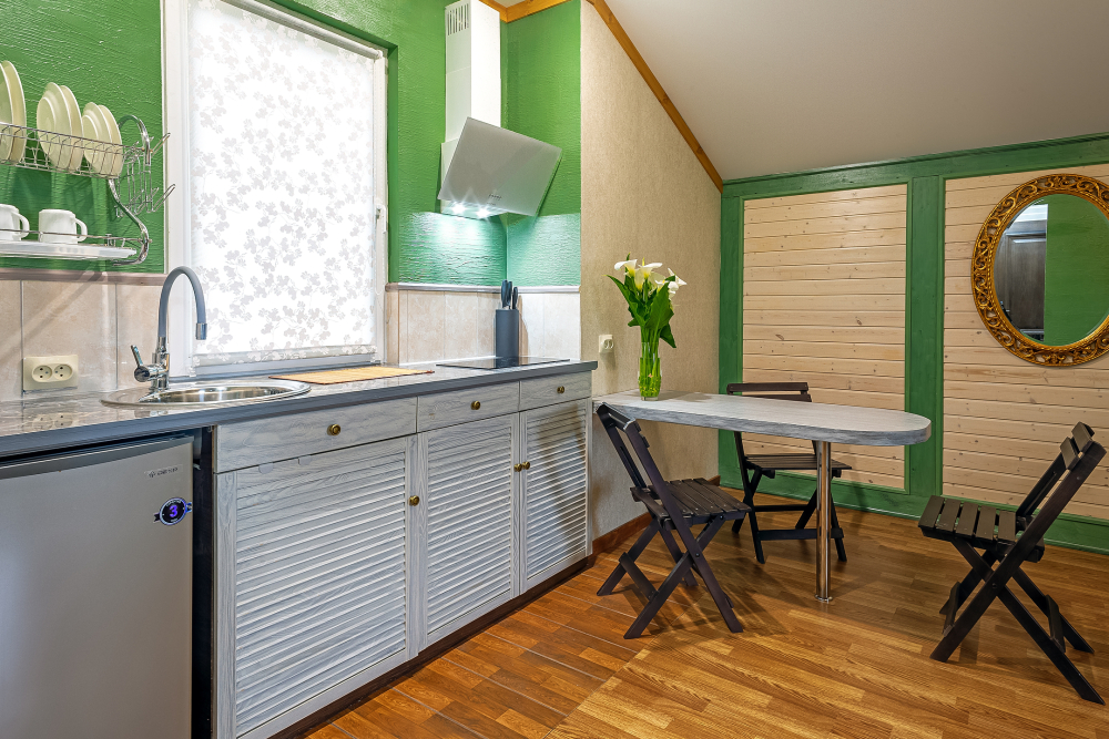 Акцентируем ваше внимание на кухне, ведь не зря говорят, что кухня является сердцем жилища – ее мы делали своими руками и постарались оснастить всем необходимым, а именно холодильником, электрической плитой на 2 конфорки, свч печью, кофеваркой, электрическим чайником и новой посудой.