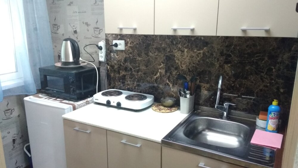 Своя кухня оборудована всем необходимым: электроплита, электрочайник, микроволновка, холодильник, посуда.