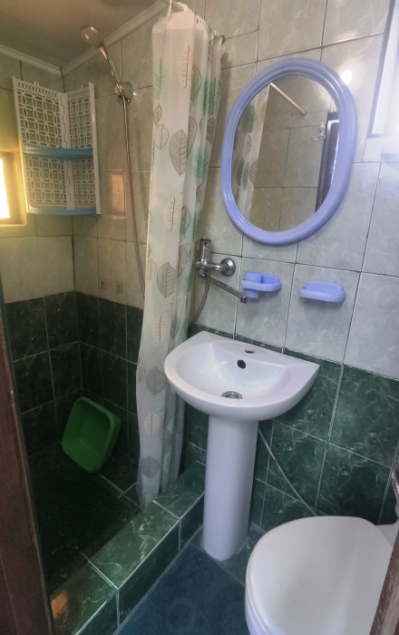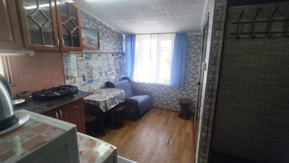 Небольшая, но оборудованная всем необходимым кухня: холодильник, газовая плита, электрочайник, микроволновка, вся посуда, горячая и холодная вода. В качестве дополнительного места стоит кресло-кровать.