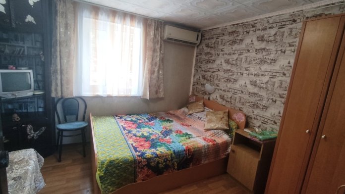 В светлой комнате есть необходимая мебель, стоит двуспальная кровать и диван-малютка.