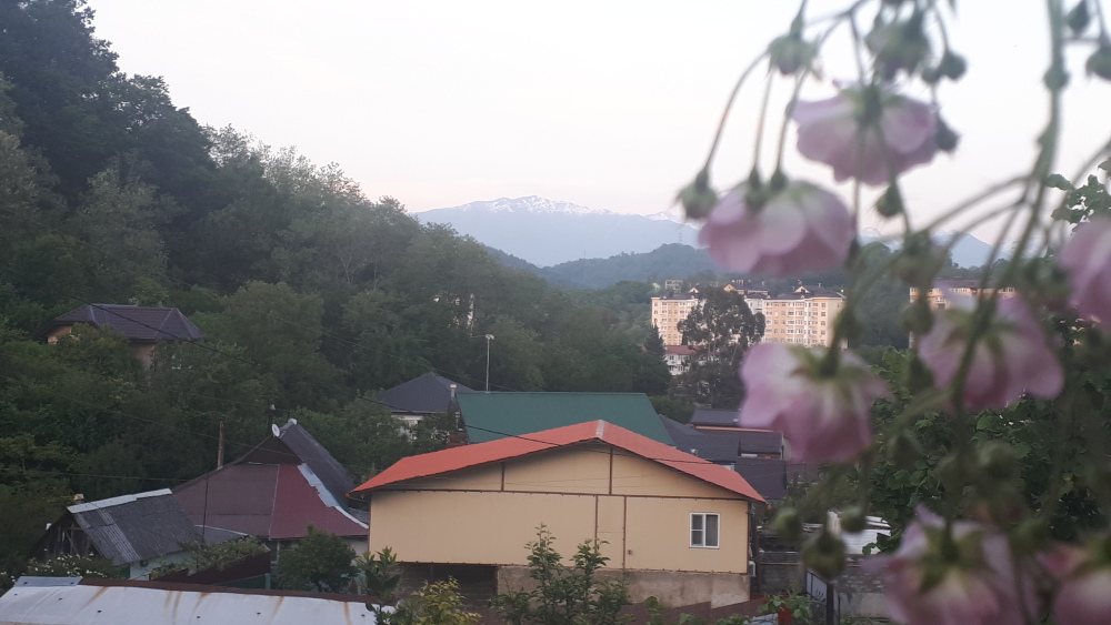 Окна выходят в сад где растёт хурма, виноград и розы.