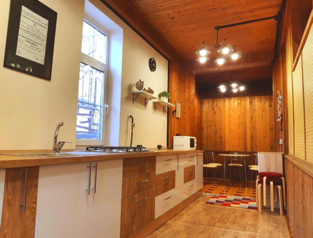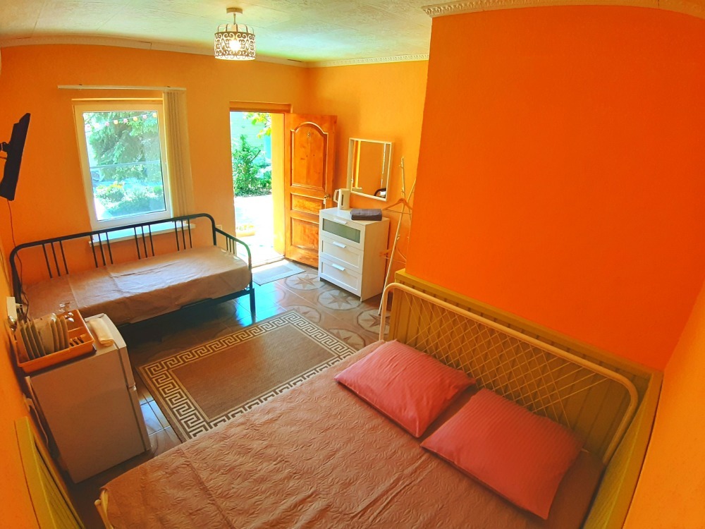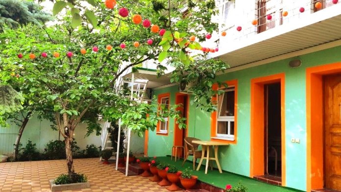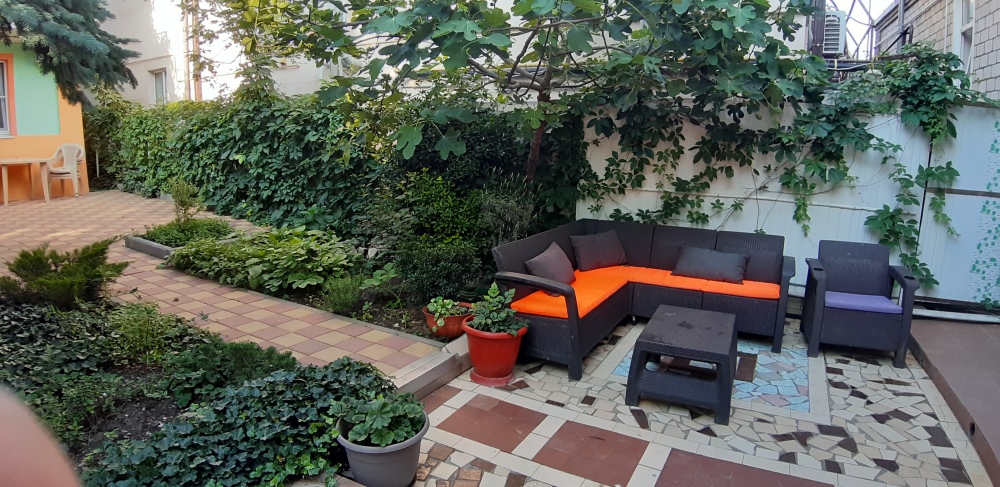 Примечателен наш дом собственным зеленым садом, где для гостей установлены столики.