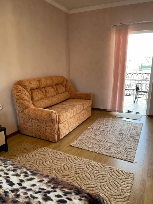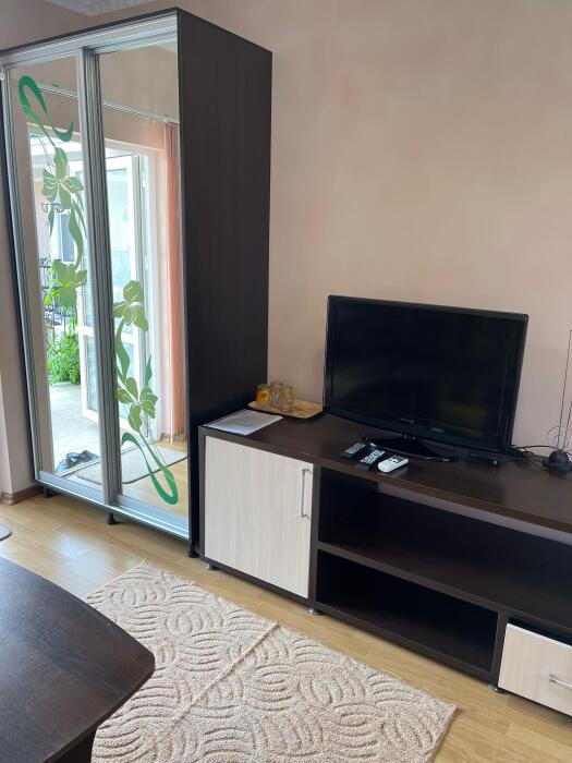 Есть свой балкон, стол со стульями и сушилка для вещей.