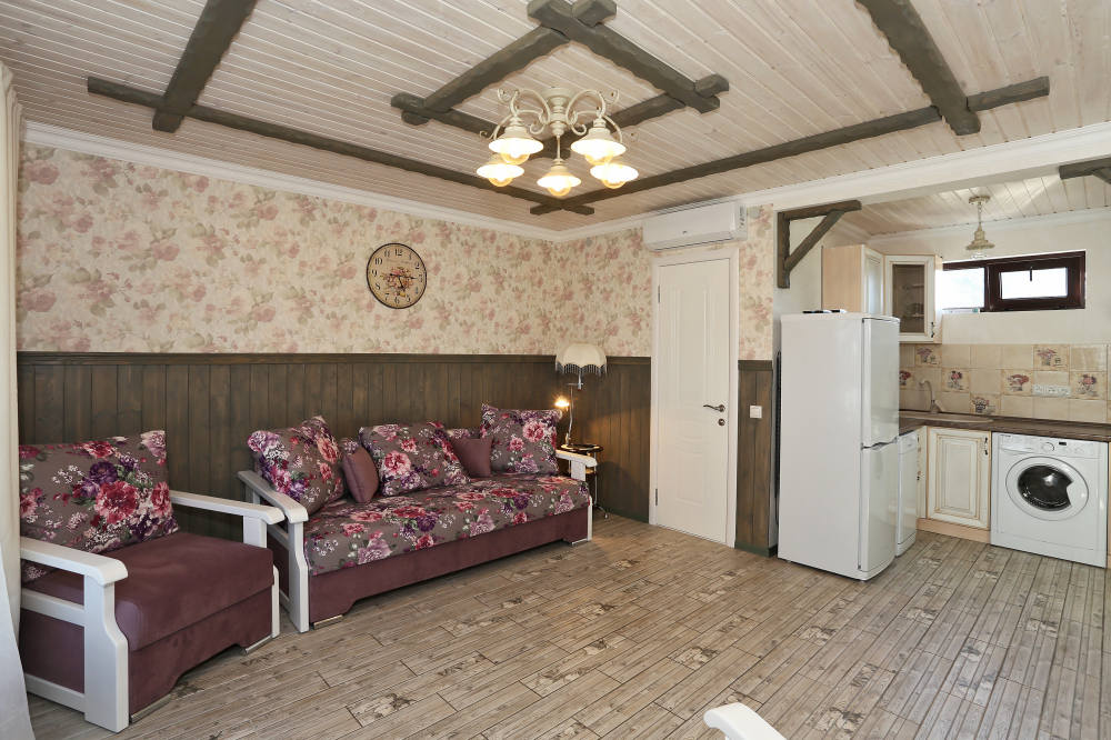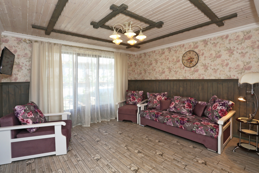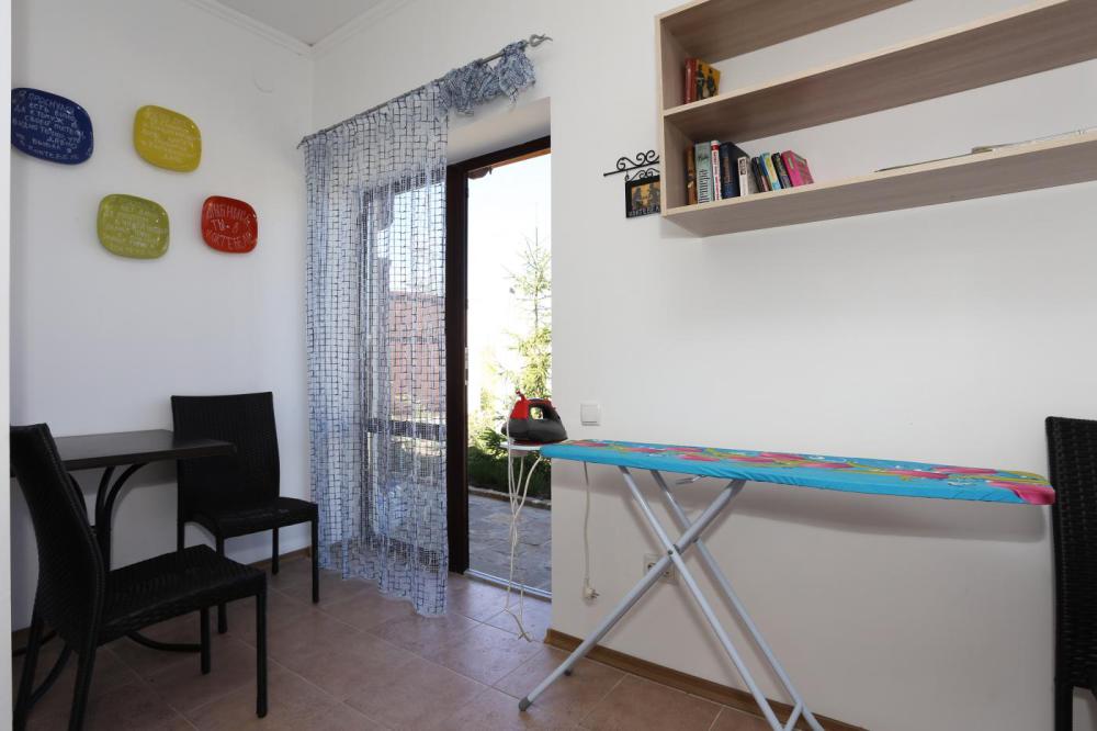 В номере: уютная мебель, набор посуды (тарелки, чашки, вилки, нож, штопор, доска).