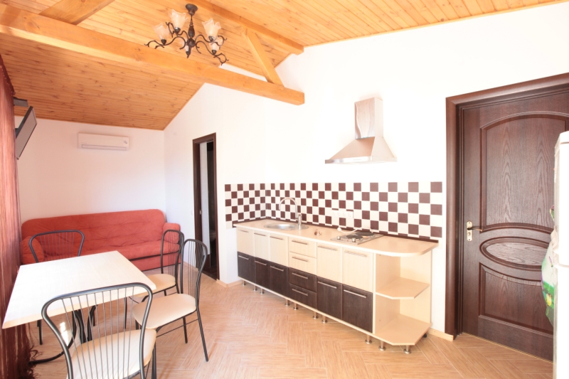 В номере: уютная мебель, оборудованная кухня,
