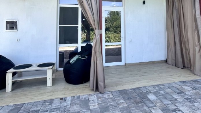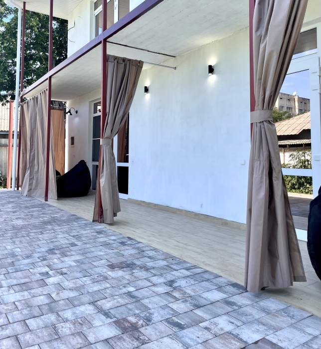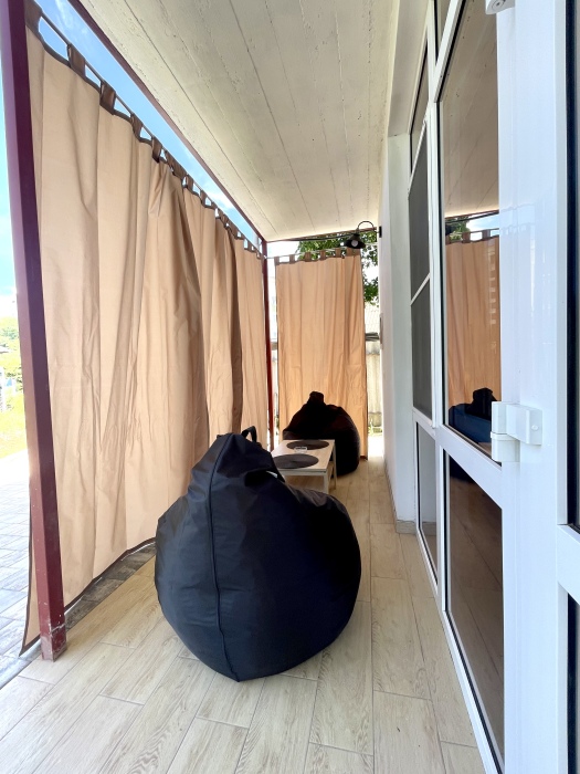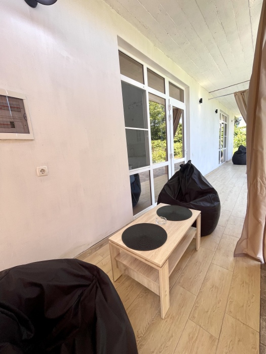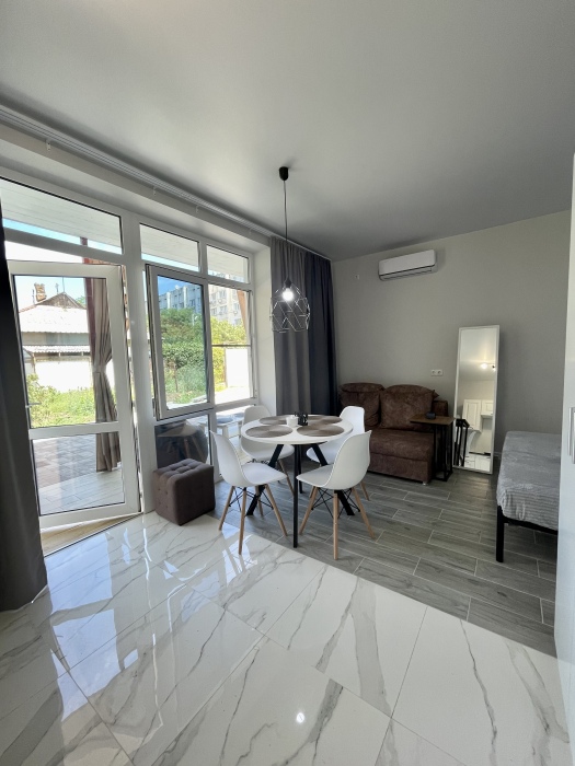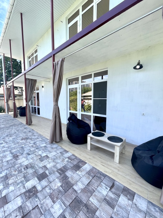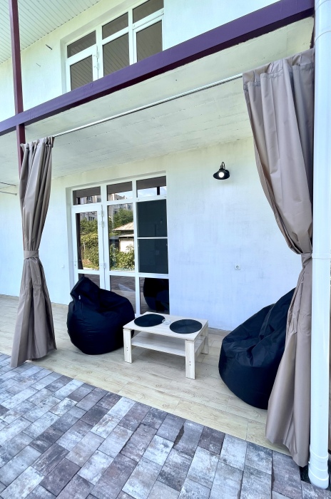 На территории 2 квартиры студии расположены на 1 этаже, тихий и уютный двор с беседками у входа в квартиру со столиком и пуфами.