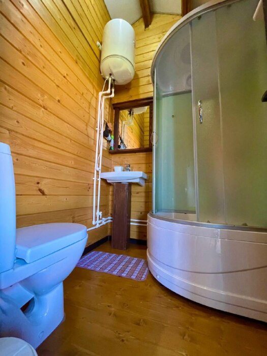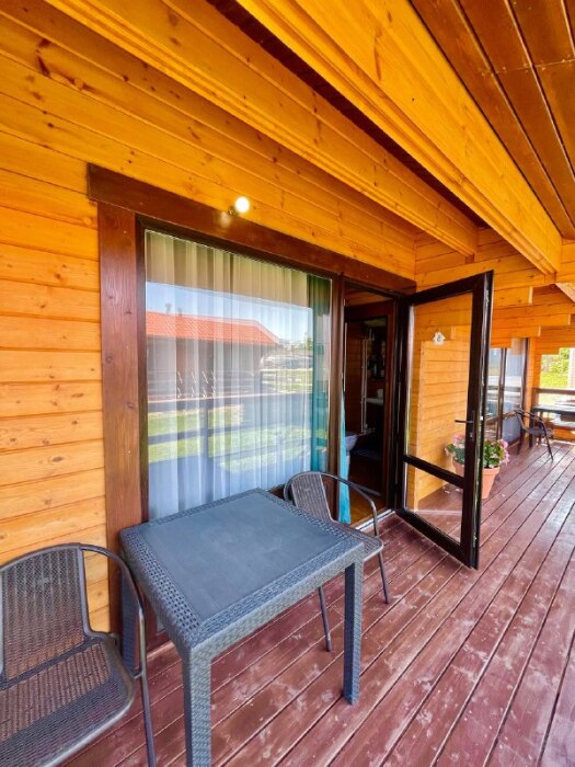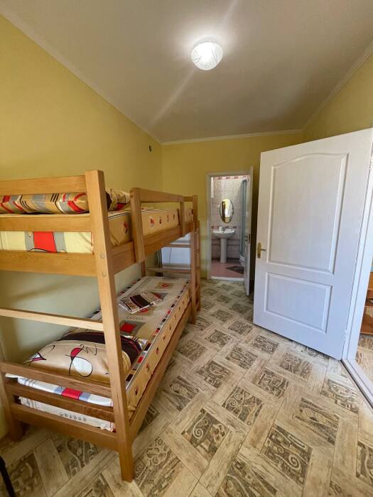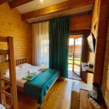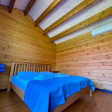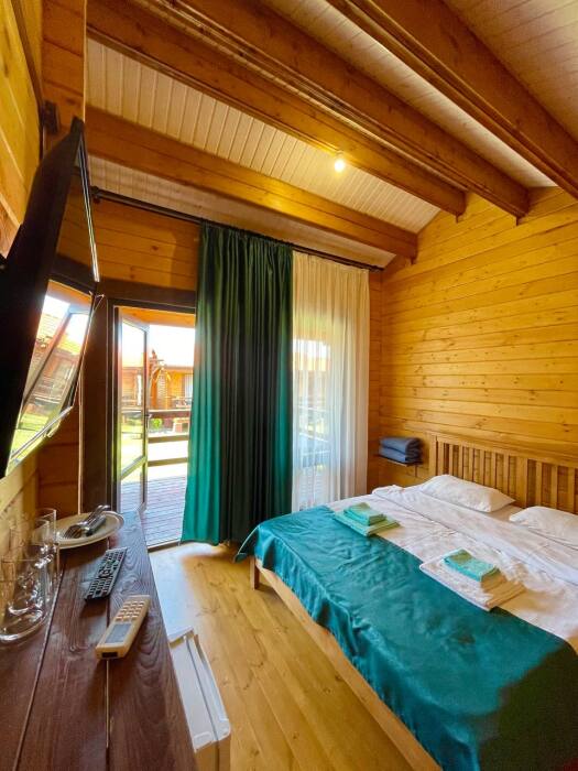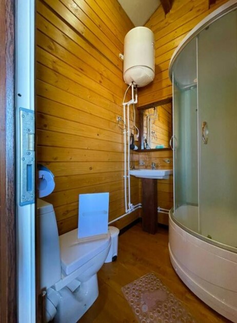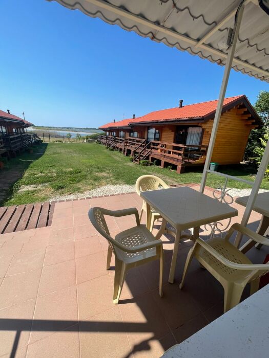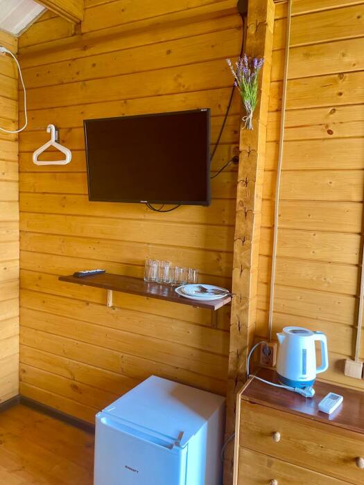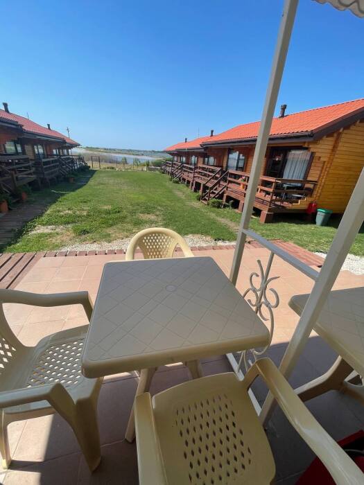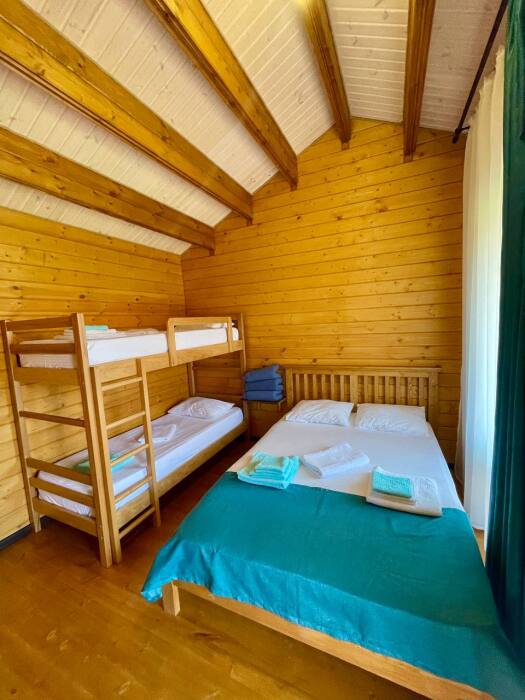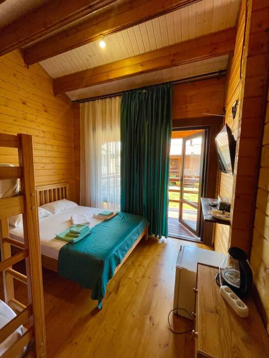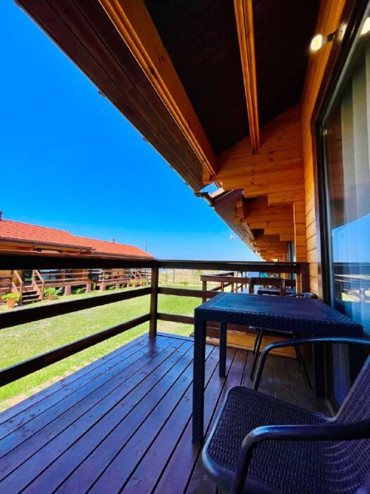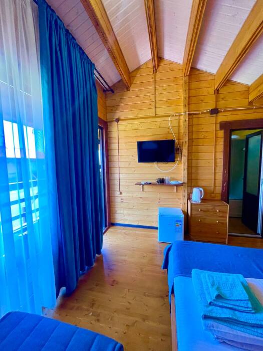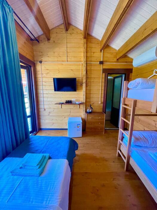 На территории есть детская площадка, новая общая просторная кухня. К Вашим услугам новые деревянные дома, 2021 года постройки, с просторной террасой и видом на море.