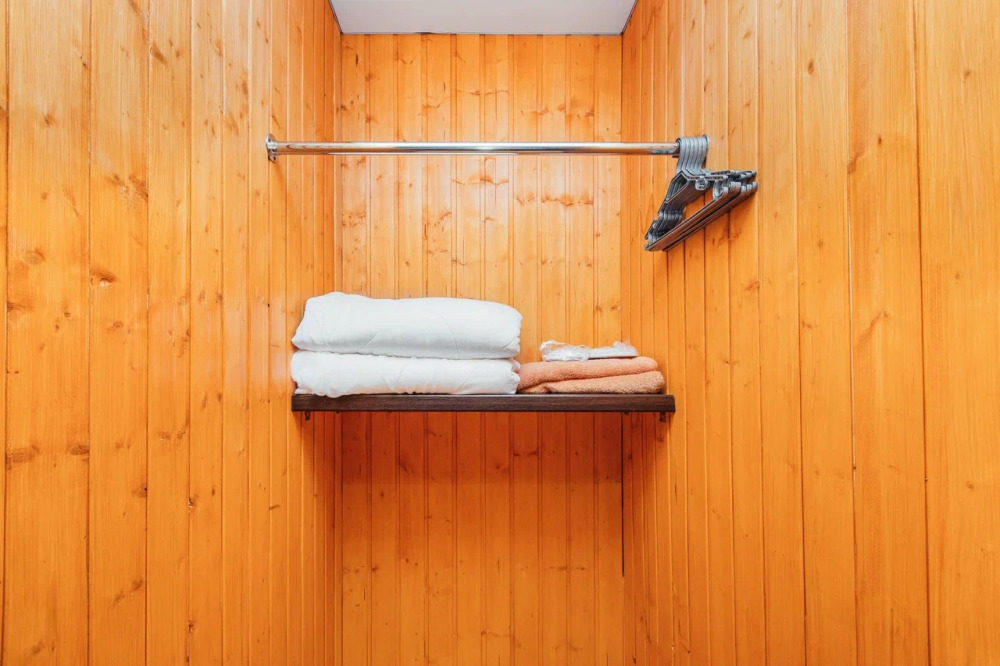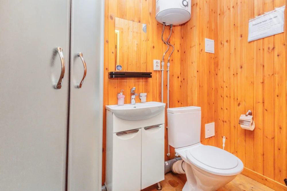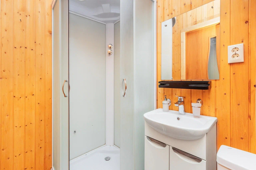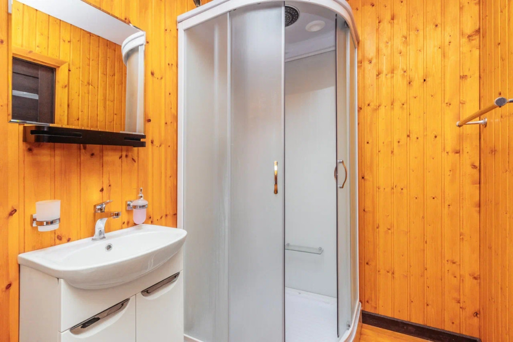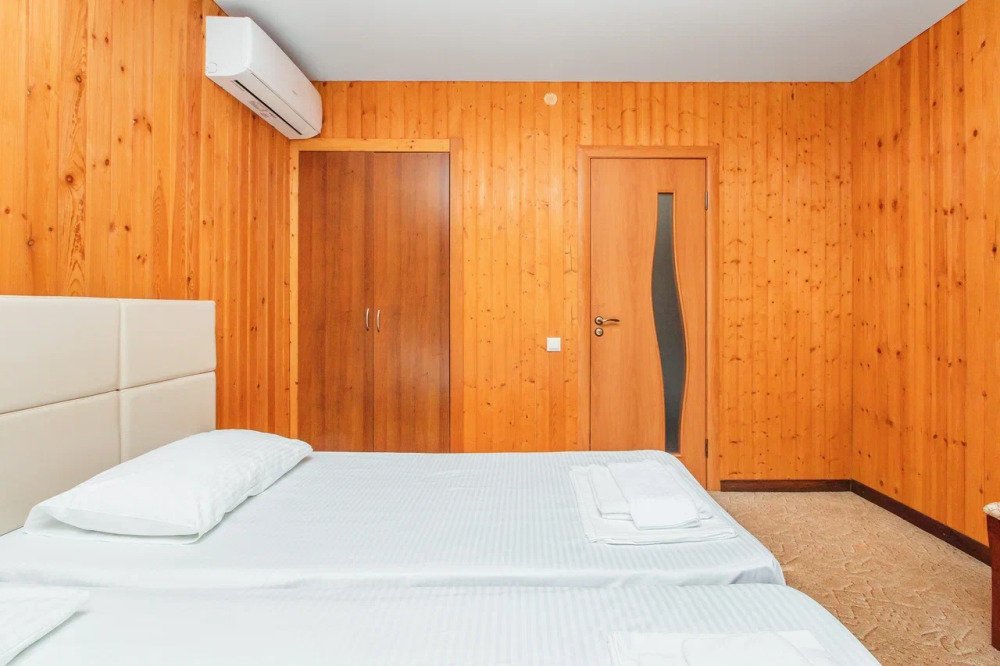 раздельными кроватями, шкаф, стол, стул, душевая кабинка, санузел.