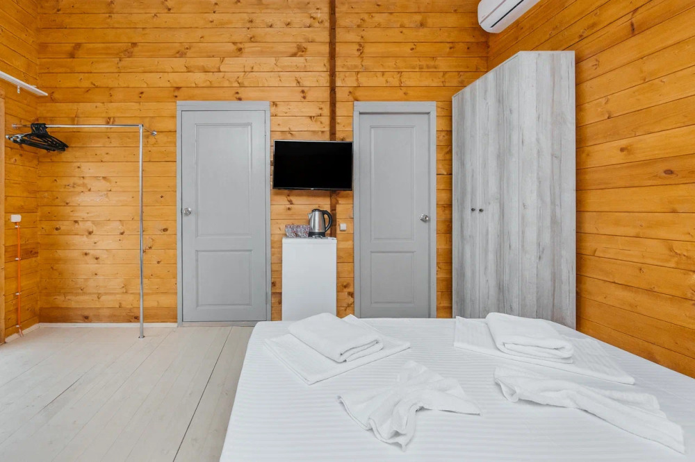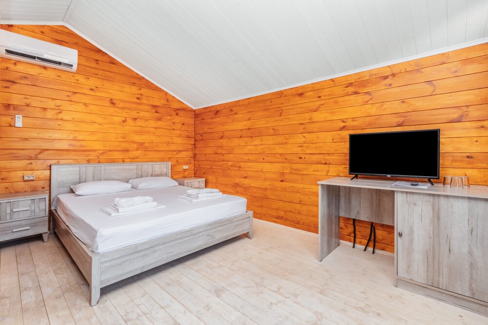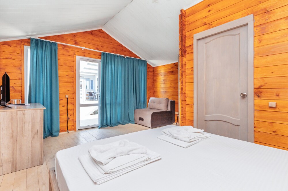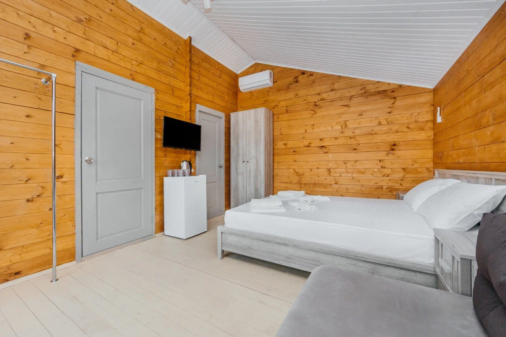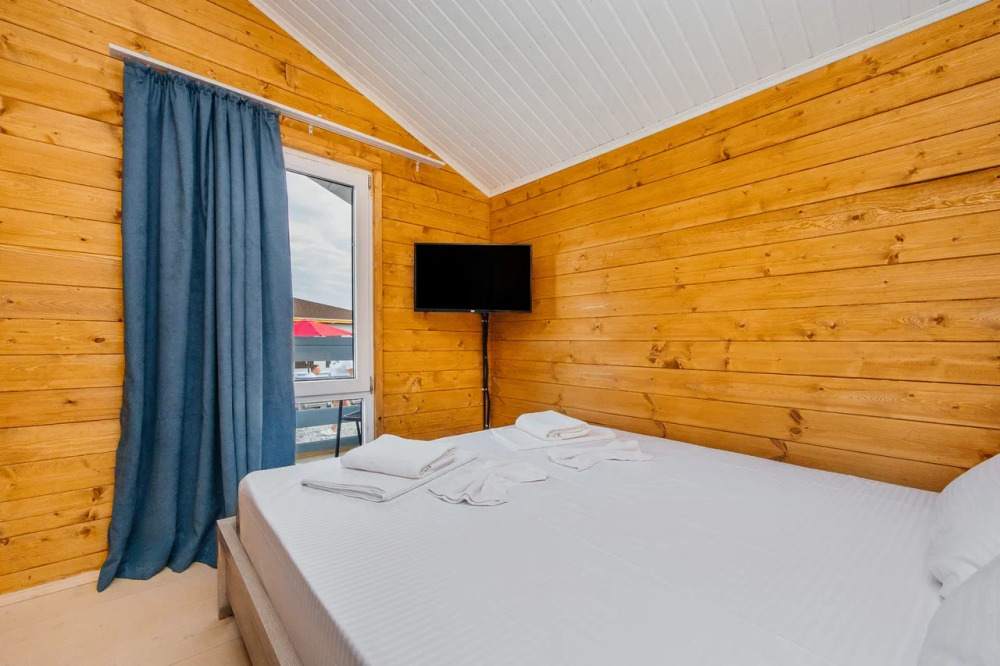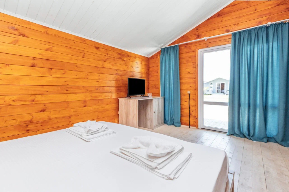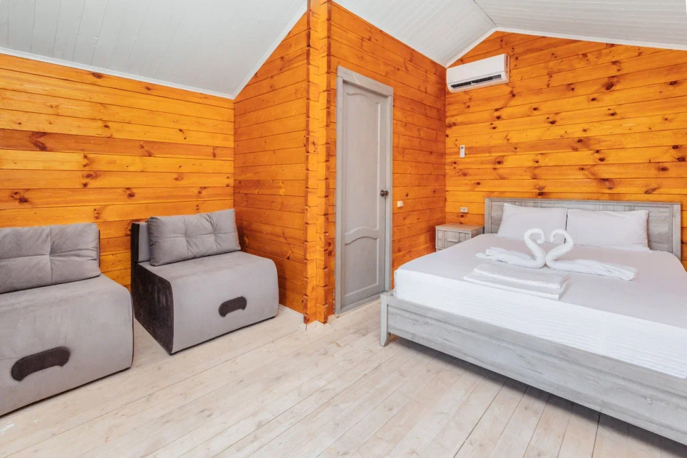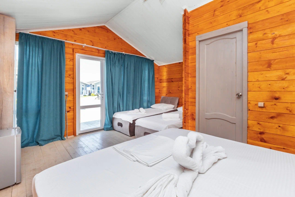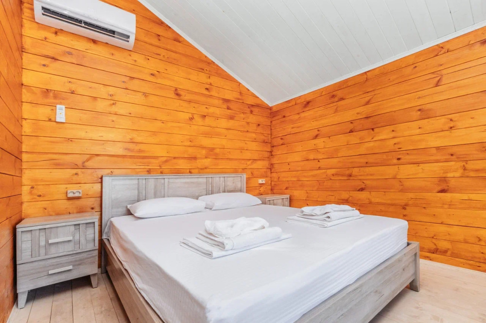 На территории отеля находятся 100 деревянных шале из сосны со всеми удобствами и отдельным входом.