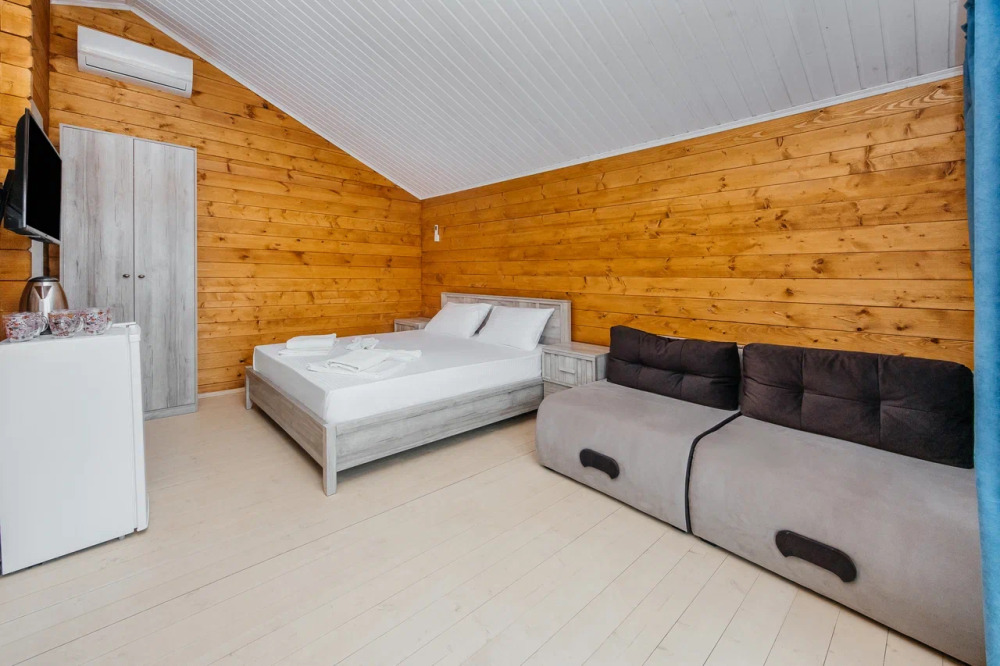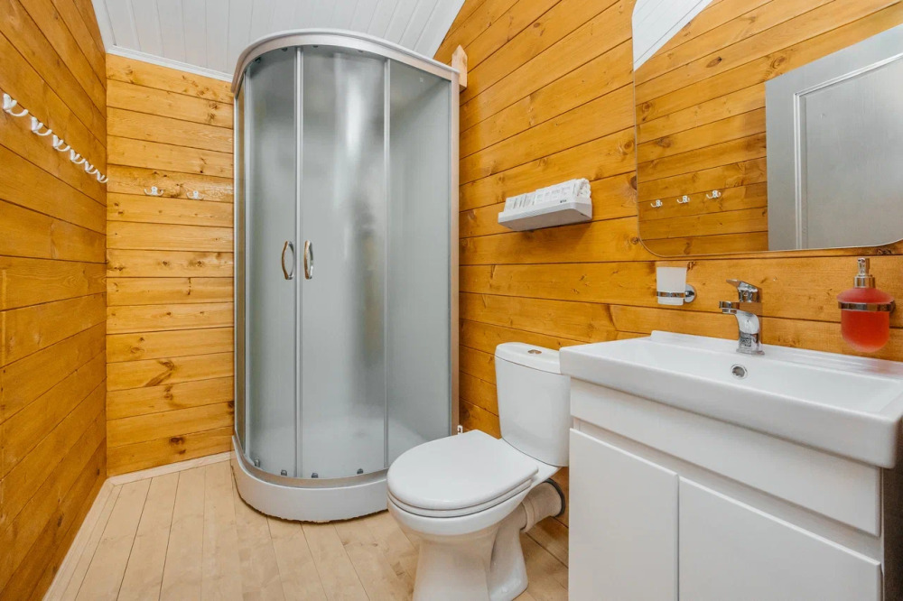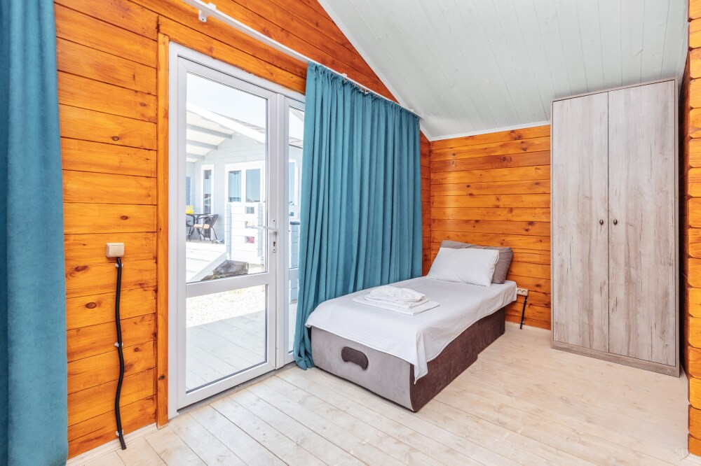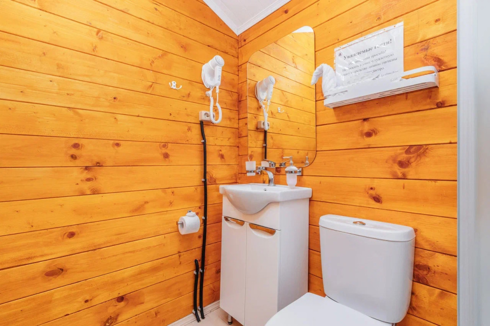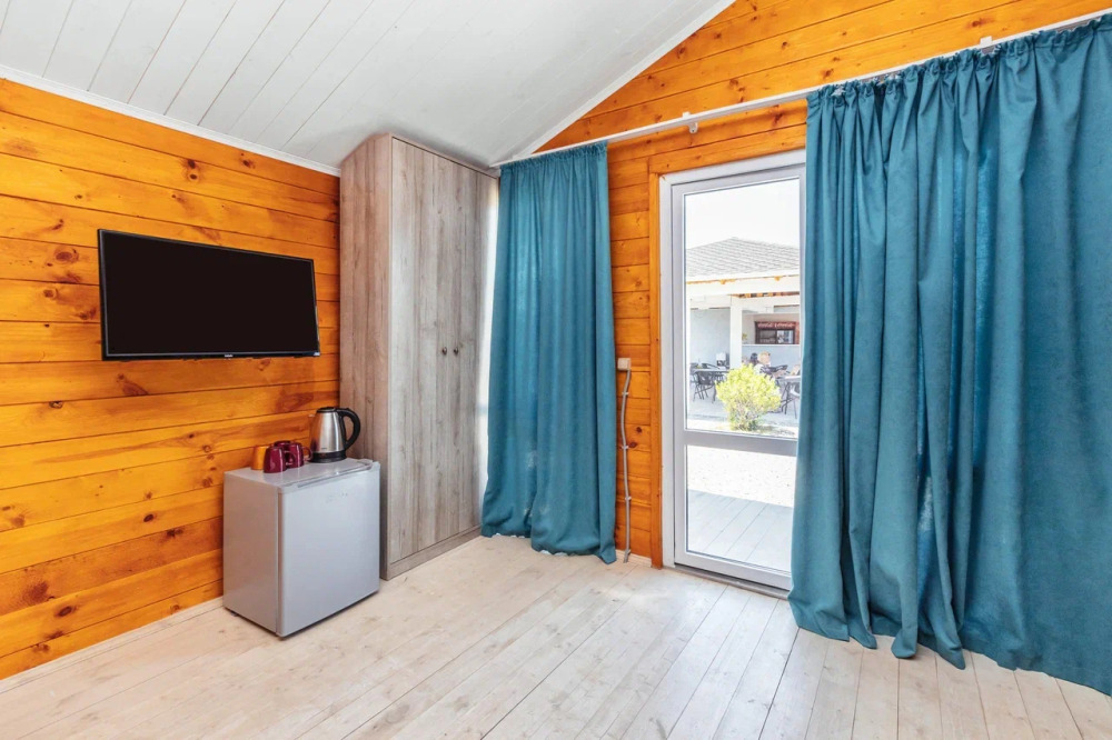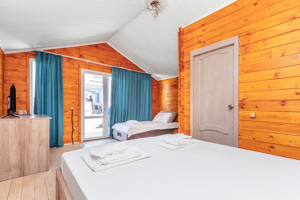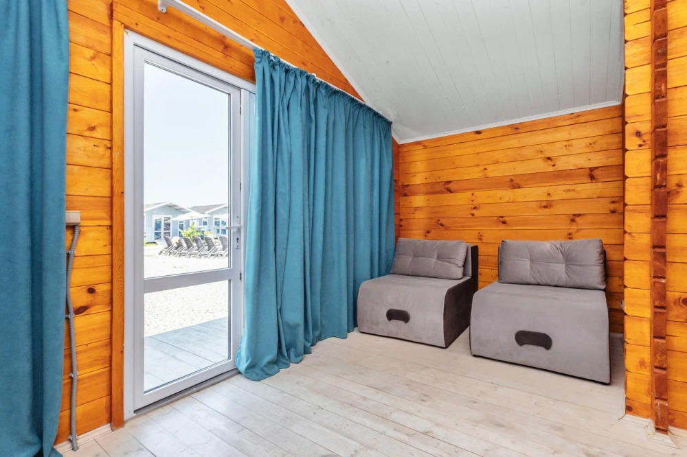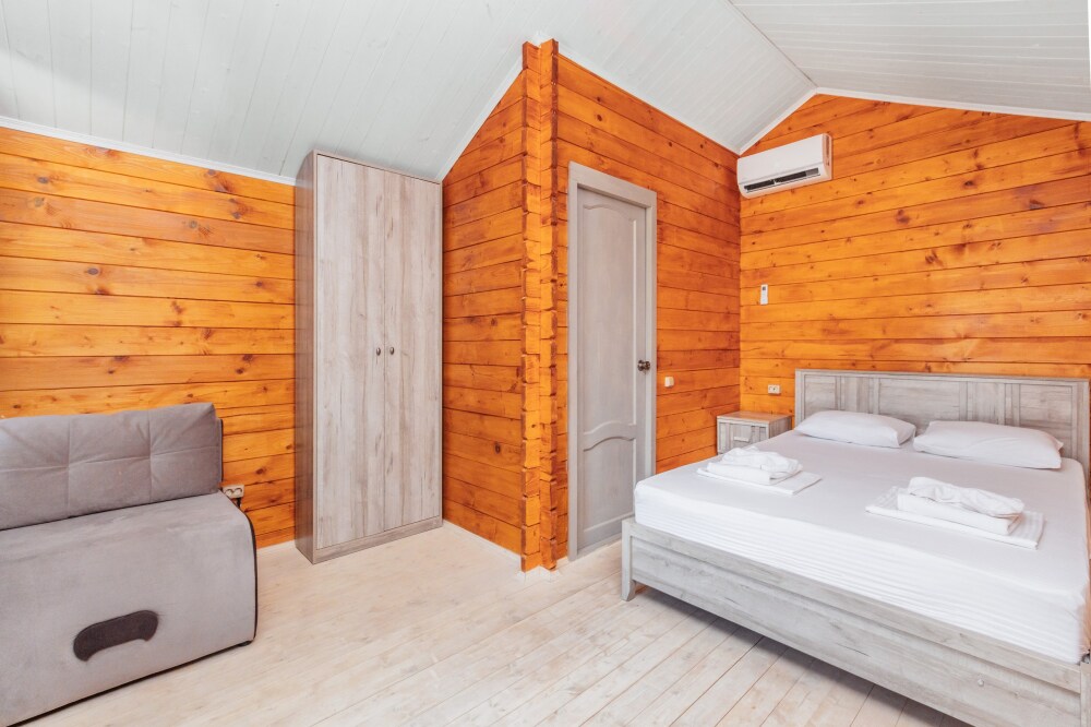 На территории отеля находятся 100 деревянных шале из сосны со всеми удобствами и отдельным входом.