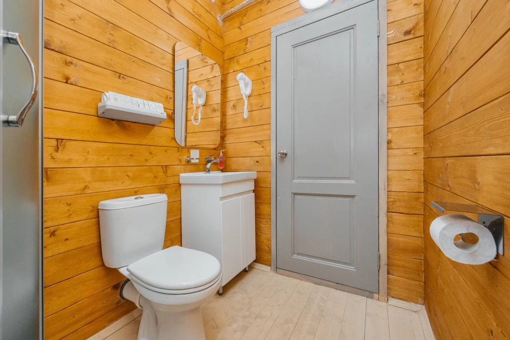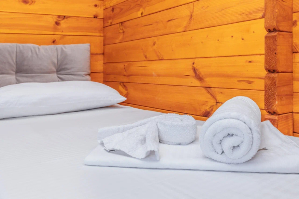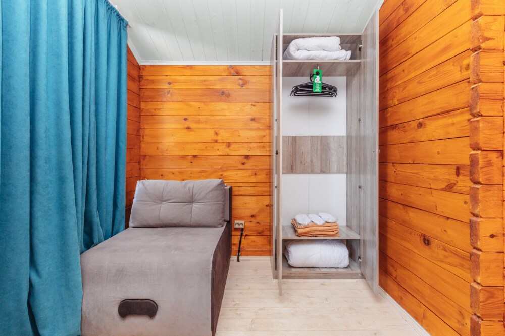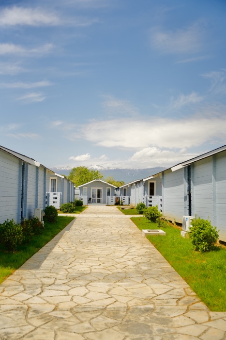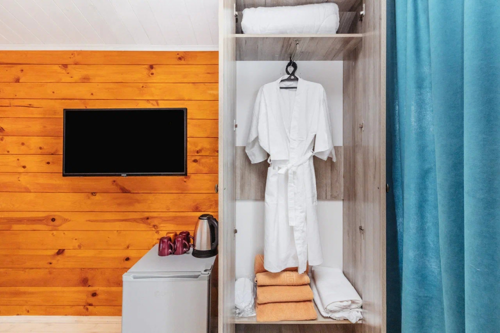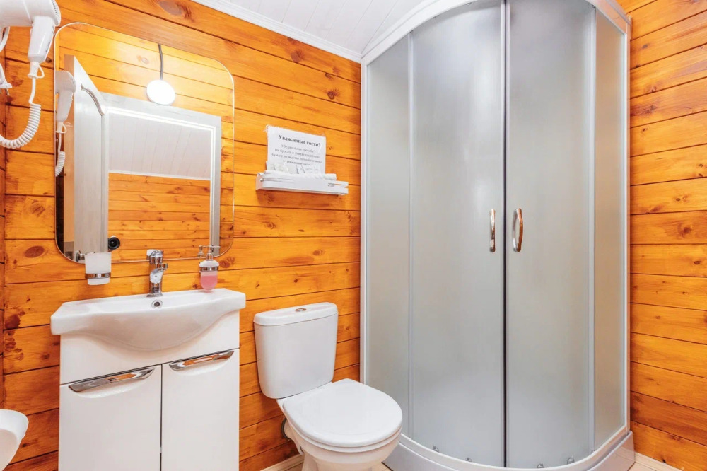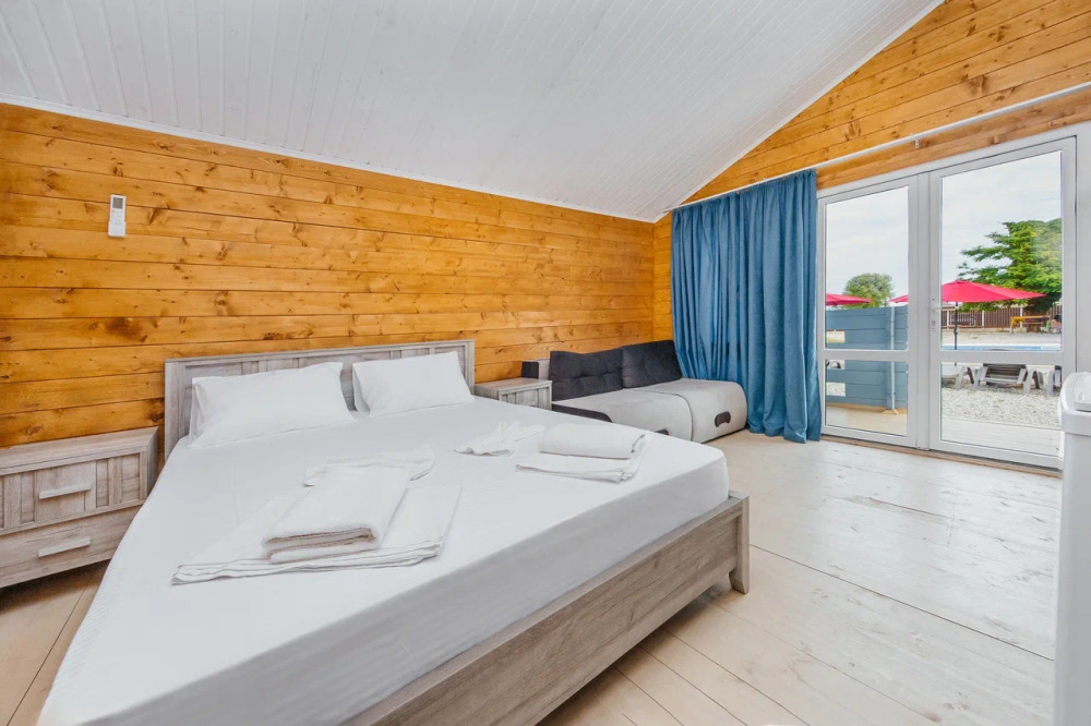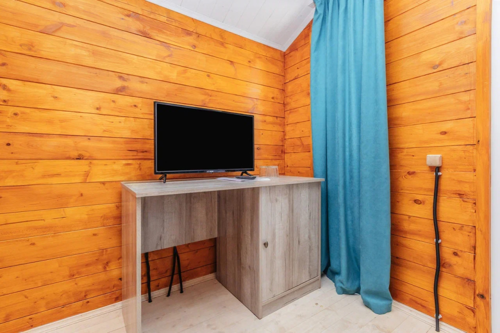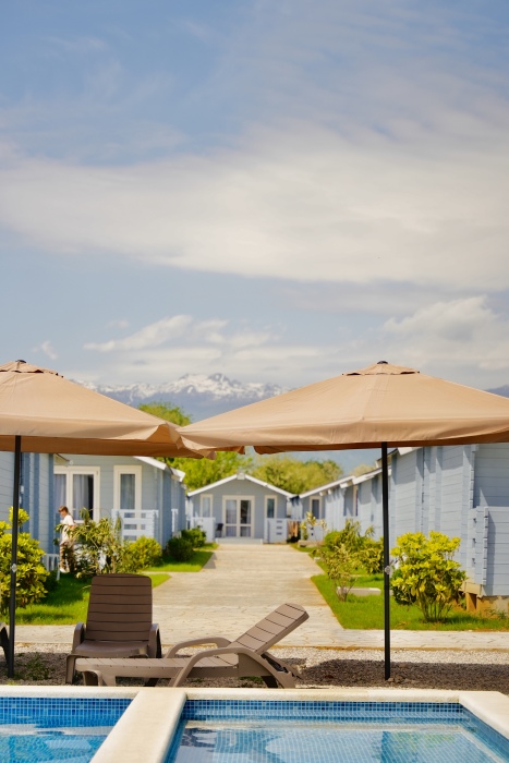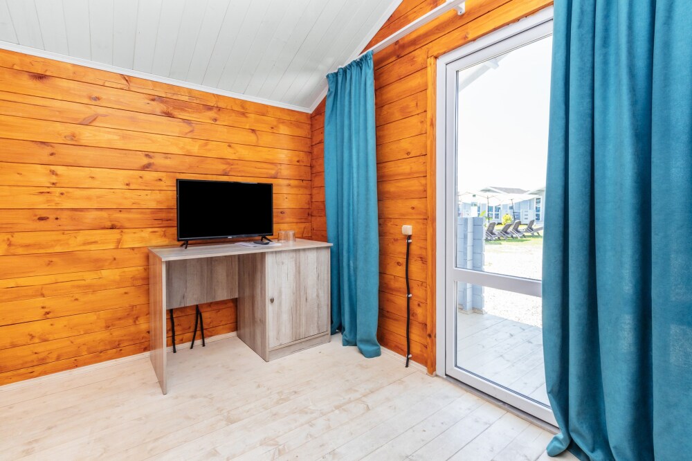 На территории отеля находятся 100 деревянных шале из сосны со всеми удобствами и отдельным входом.