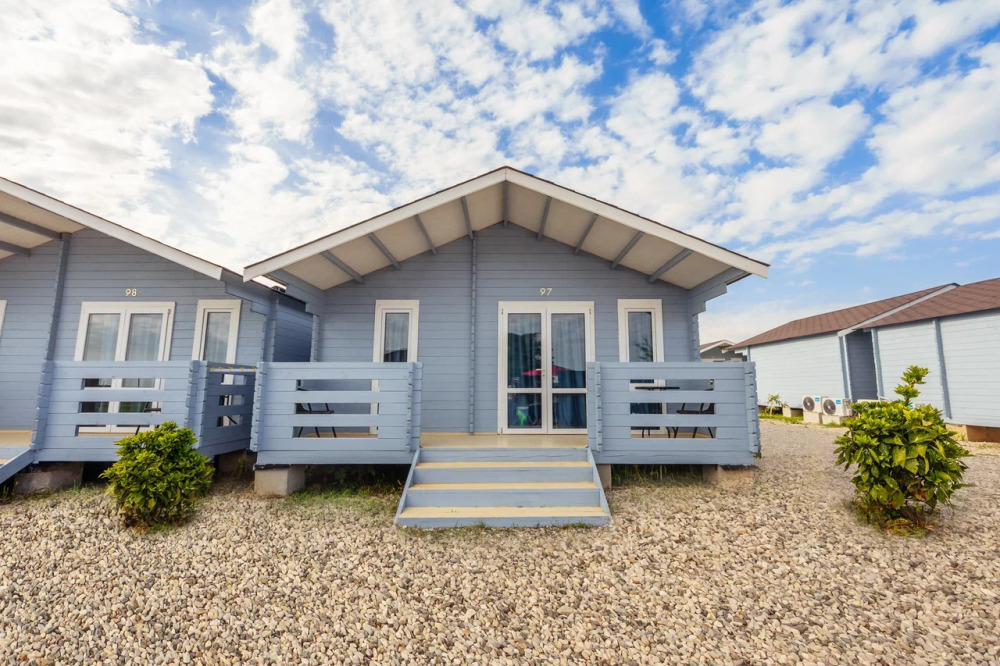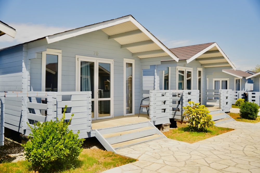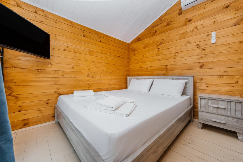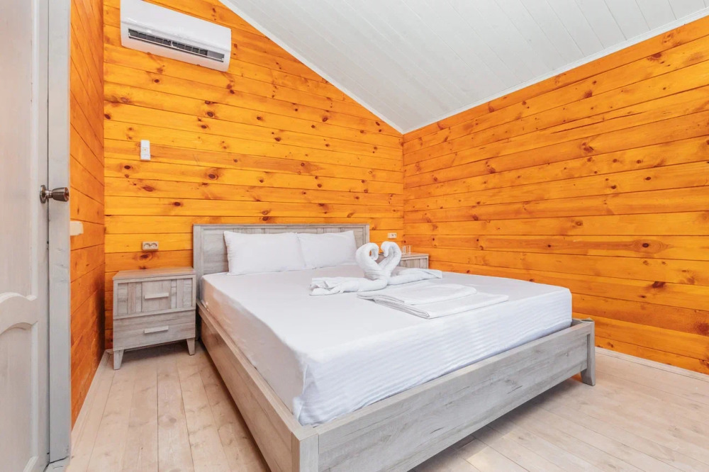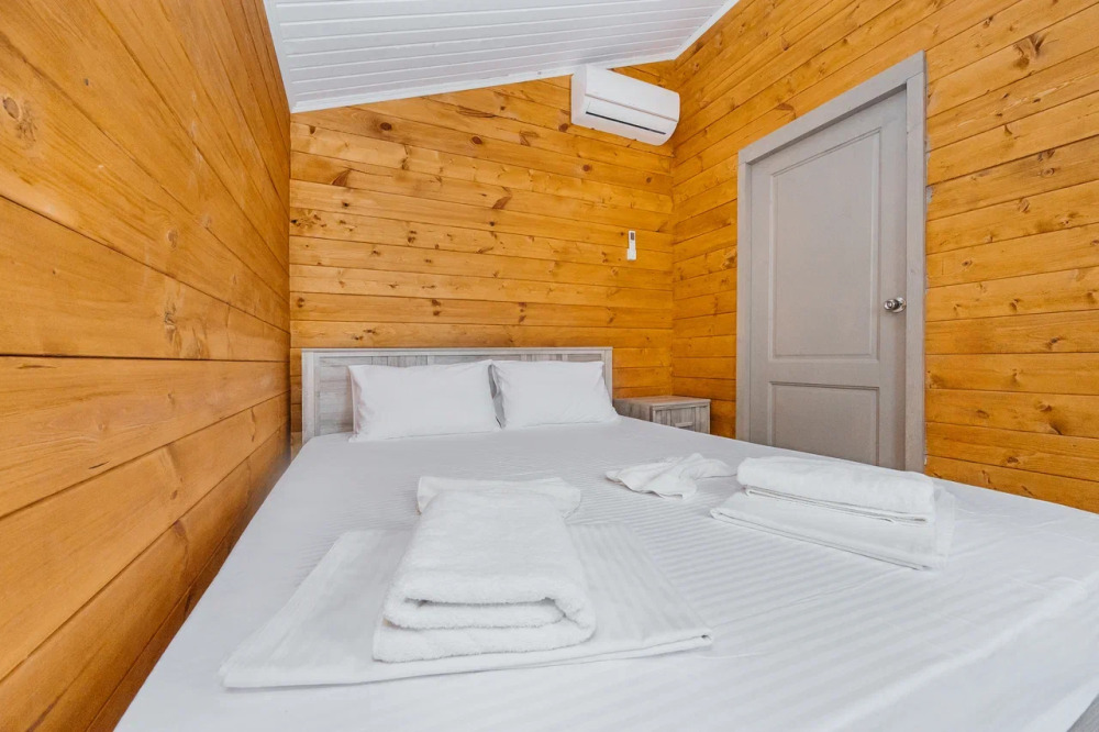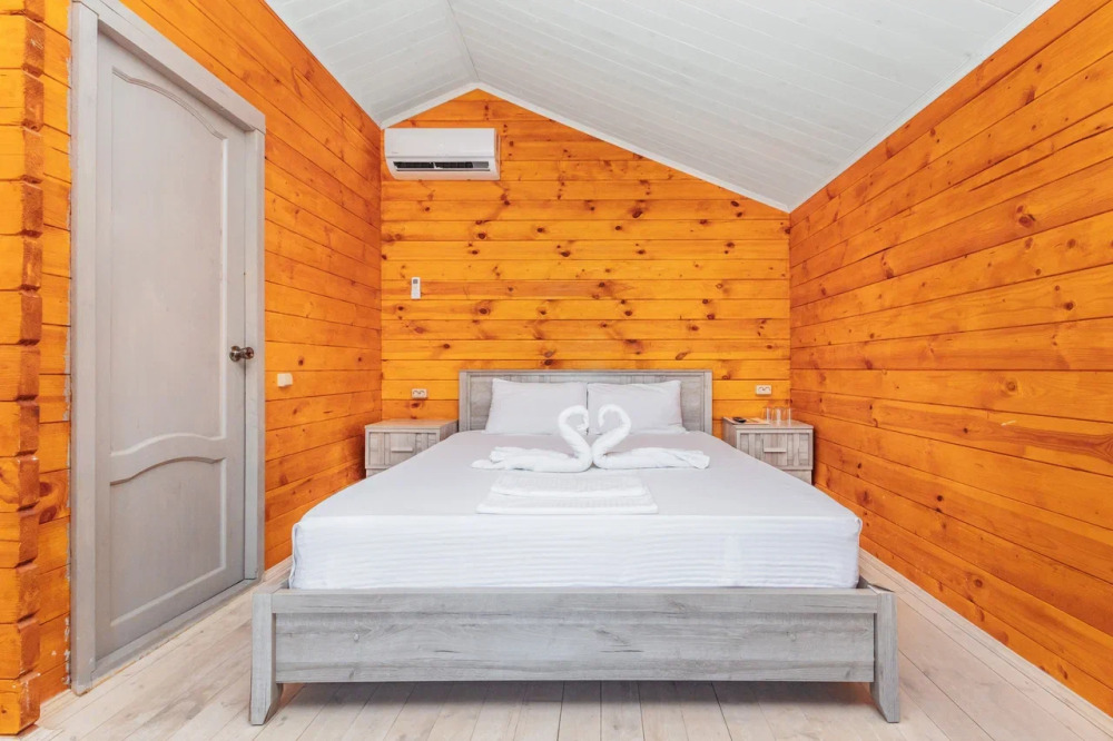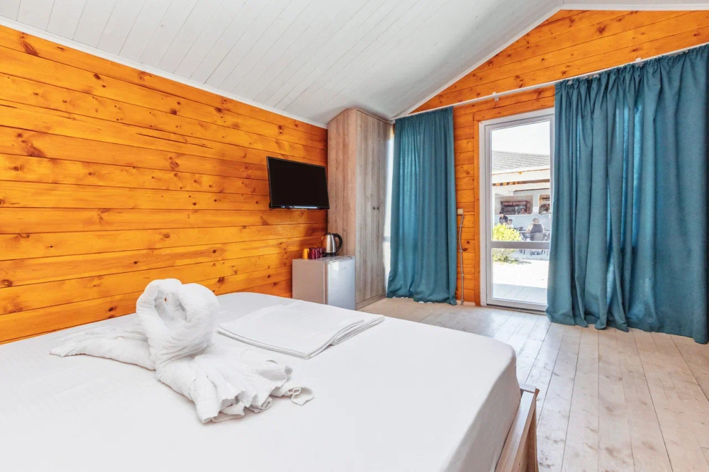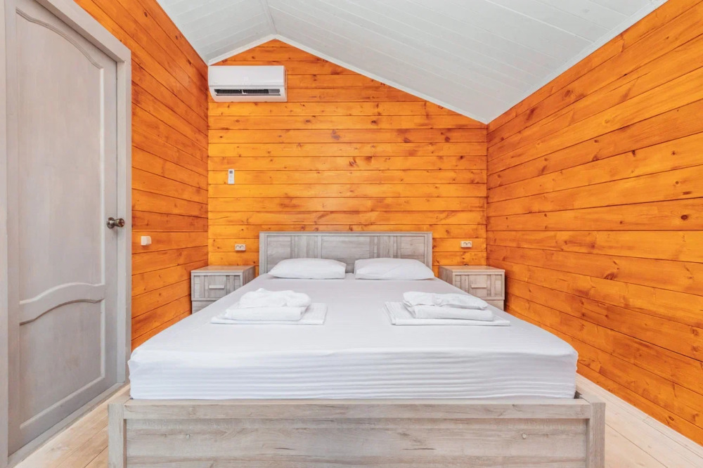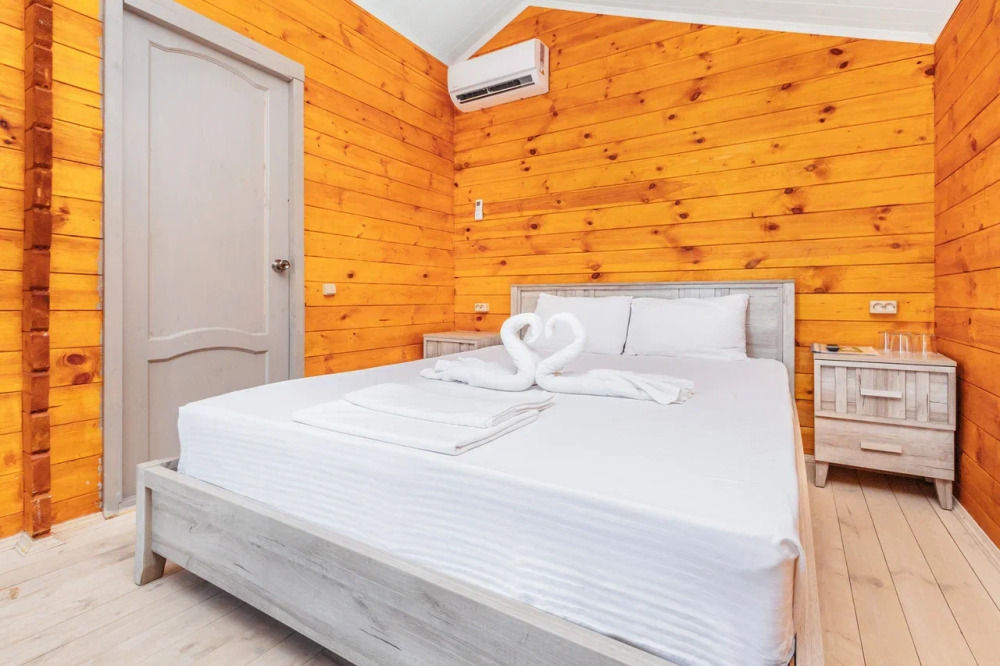 Номерной фонд отеля – 100 отдельно стоящих деревянных домика с отдельным входом.