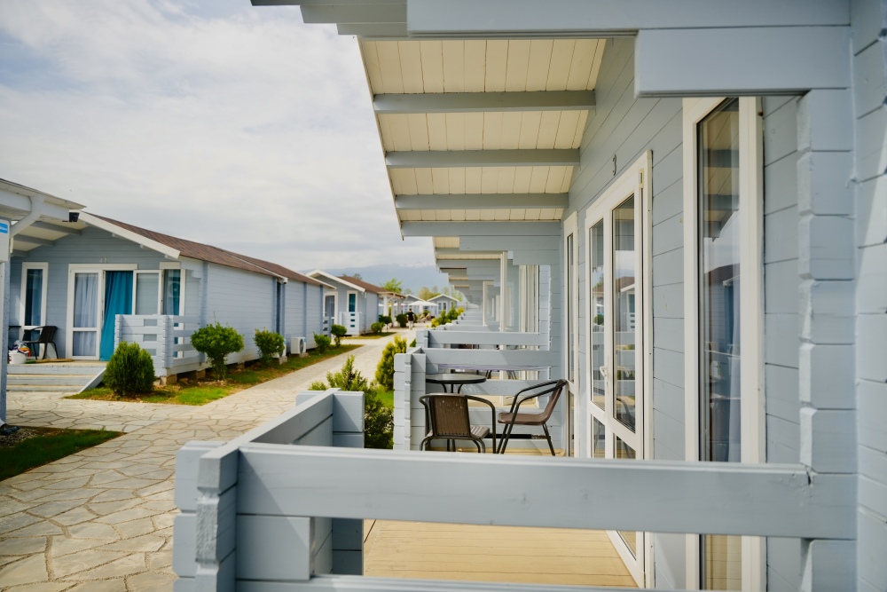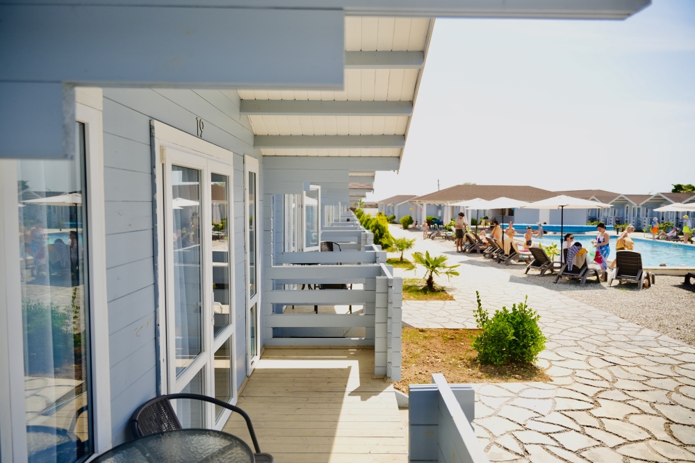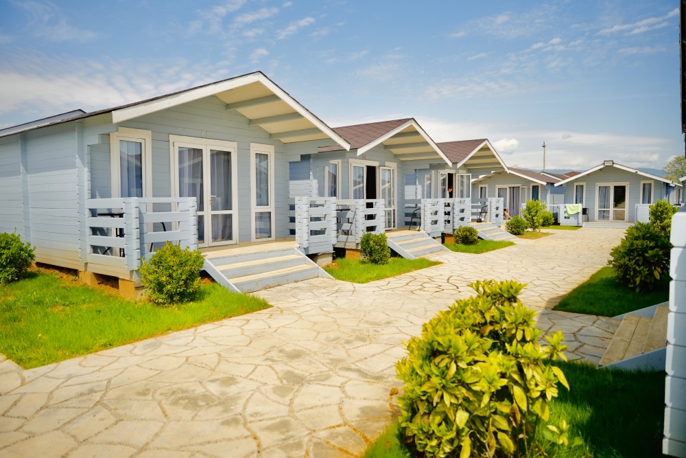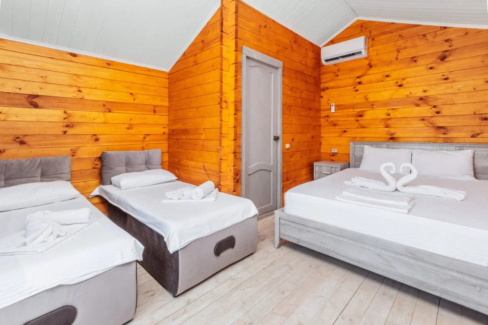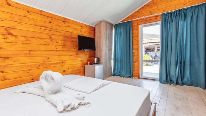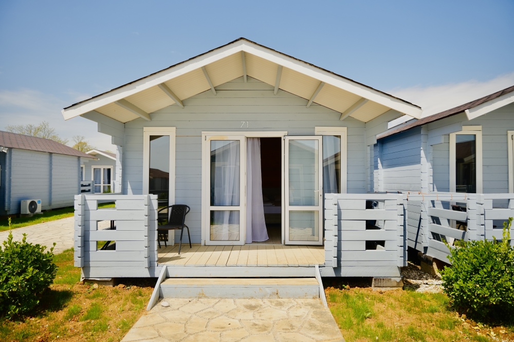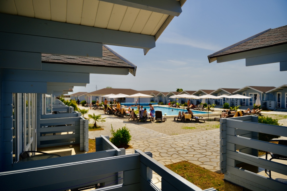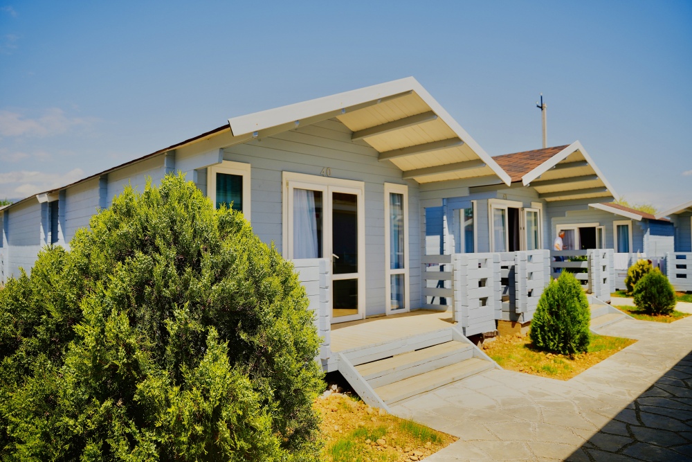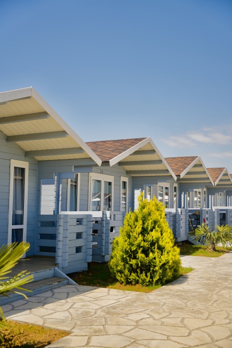 Номерной фонд отеля – 100 отдельно стоящих деревянных домика с отдельным входом.