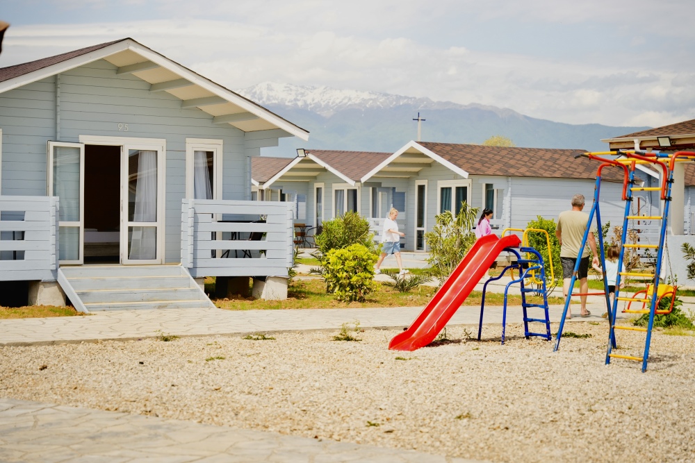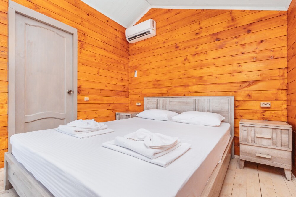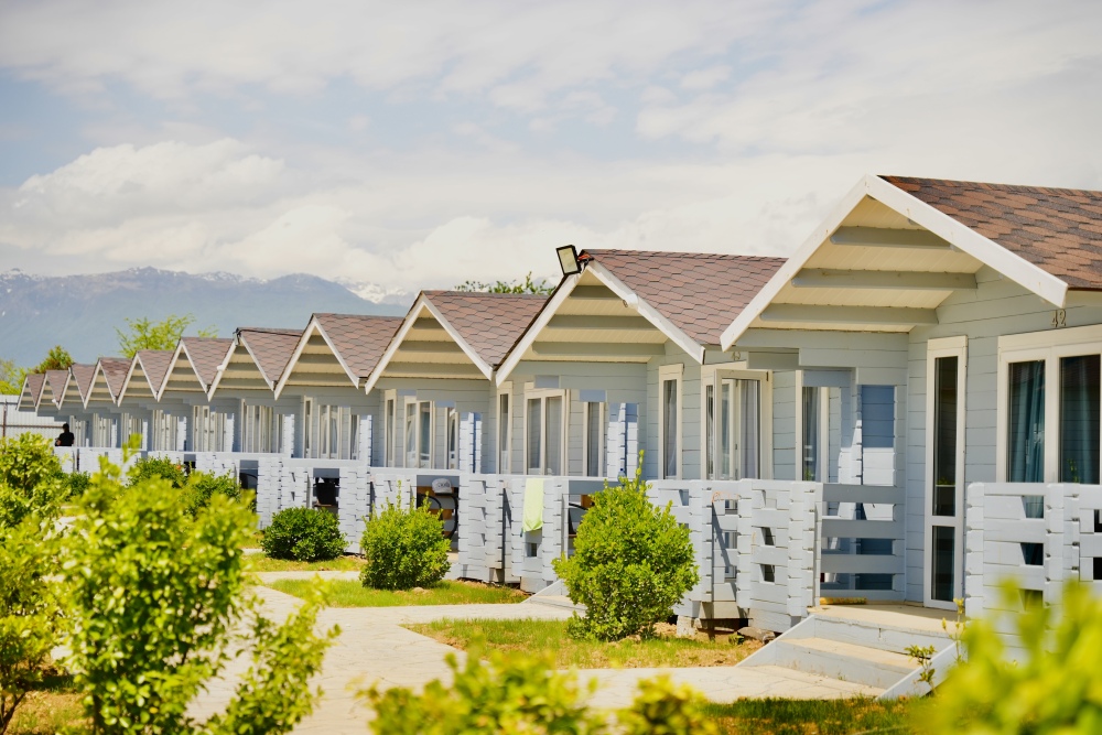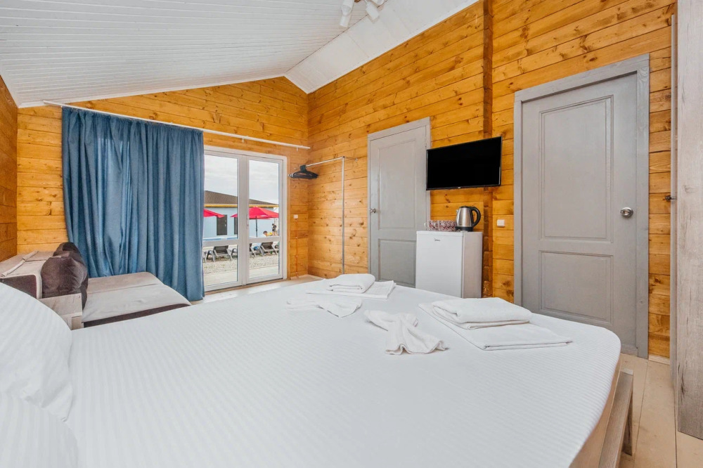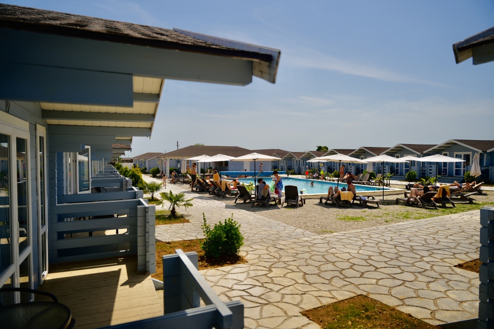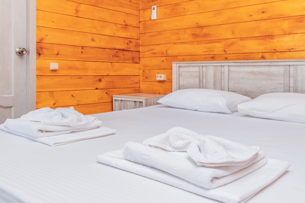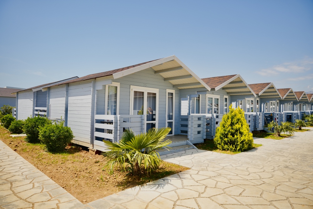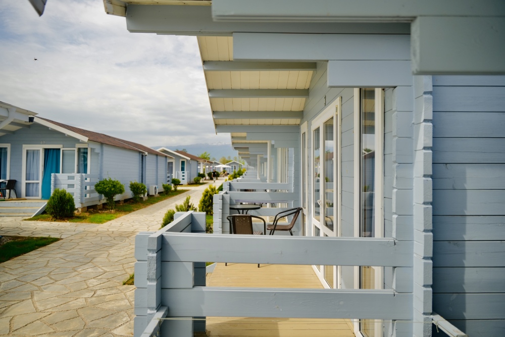 Номерной фонд отеля – 100 отдельно стоящих деревянных домика с отдельным входом.