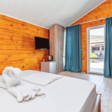 Комплектация номера: комфортабельный однокомнатный номер с балконом с отдельным входом, со всеми удобствами, оборудован одной двуспальной кроватью, 1 кресло-кровать, шкаф, стол, стул, душевая кабинка, санузел. Комплект полотенец, постельное белье, телевизор, система регулирования температурного режима (кондиционер), холодильник, фен, туалетная косметика (шампунь, гель для душа, мыло), тапочки.