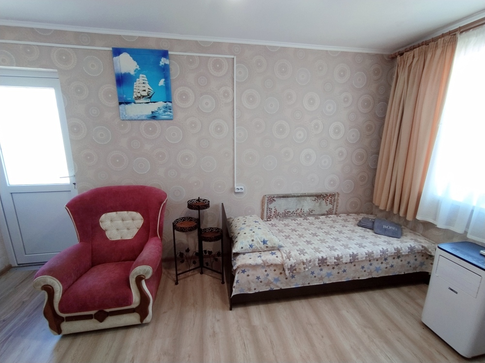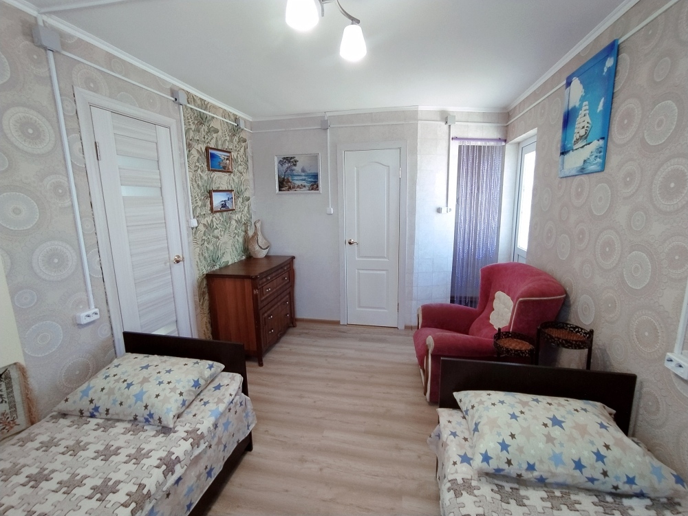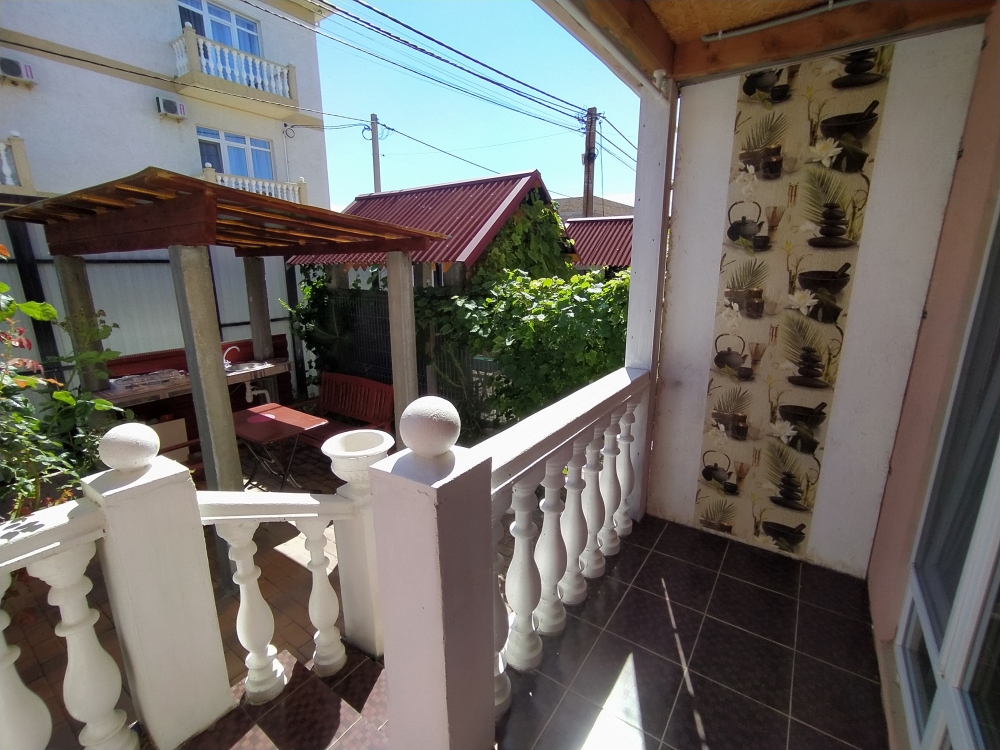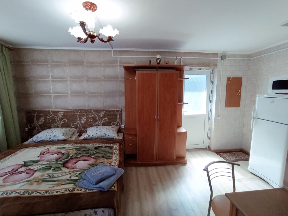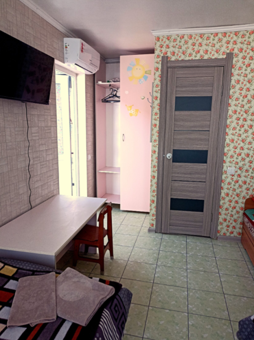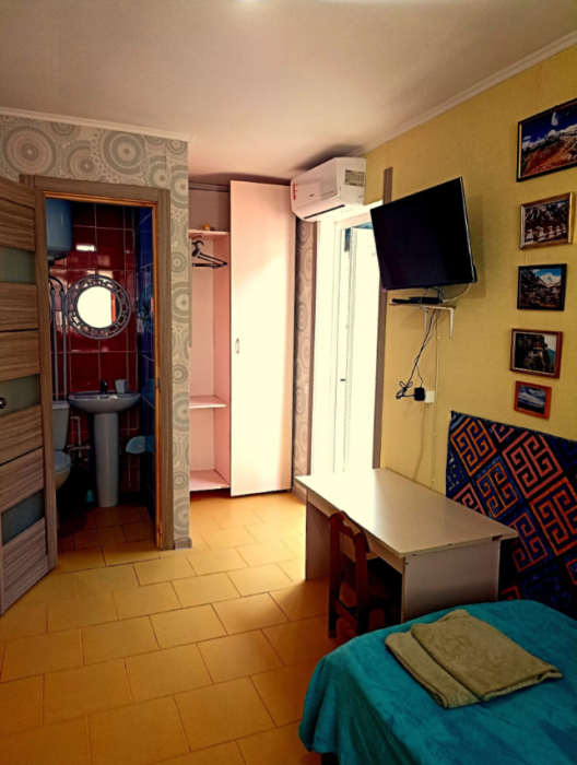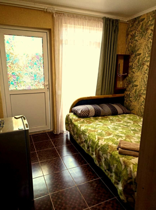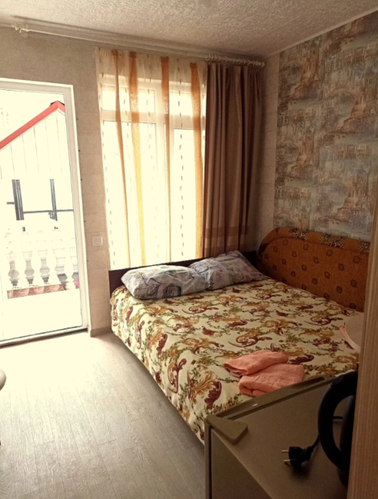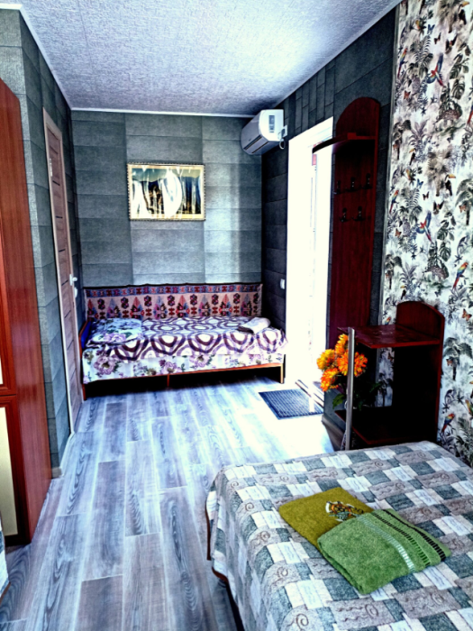 На первом этаже комната с верандой, санузлом и душем. Холодильник, чайник, двуспальная кровать. Кондиционеры на каждом этаже.