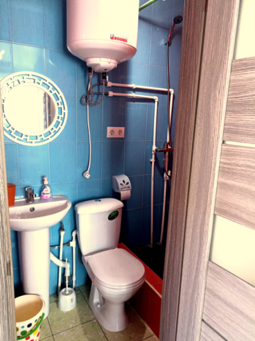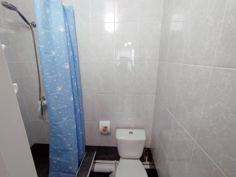 На втором этаже комната с санузлом, кровати, шкаф, телевизор.